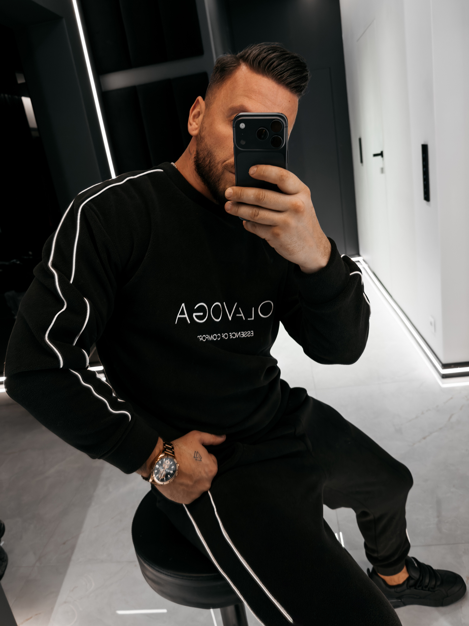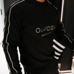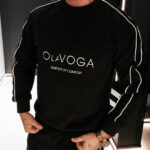 Górną część kompletu stanowi bluza o klasycznym kroju z okrągłym dekoltem, który nadaje całości ponadczasowy charakter. Długie rękawy wykończone elastycznymi ściągaczami zapewniają stabilność fasonu oraz estetyczne dopasowanie. Subtelny, tłoczony haft z logo OLAVOGA oraz hasłem „ESSENCE OF COMFORT” umieszczony na przodzie stanowi elegancki, nowoczesny detal brandingowy. Wzdłuż rękawów poprowadzono delikatne kontrastowe lampasy, które przełamują minimalistyczną formę i nadają bluzie modowego wyrazu.