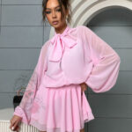 Kombinezon Selietto w odcieniu delikatnego różu to idealna propozycja dla kobiet, które kochają subtelność, zwiewność i efektowne detale. Wykonany z cienkiego, lekko prześwitującego szyfonu, zachwyca lekkością oraz nowoczesnym, kobiecym charakterem. To model, który sprawdzi się zarówno na randkę, letnie wyjścia, jak i eleganckie okazje w subtelnym, pastelowym stylu.