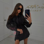 Cały komplet wykonany został z lejącego, delikatnego materiału, który pięknie układa się na ciele i zapewnia swobodę ruchów. Komplet z klasycznym wzorem w groszki tworzy wyjątkowo kobiecą i stylową całość, idealną zarówno na co dzień, jak i na bardziej eleganckie wyjścia.