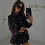 Górna część kompletu Mitti to koszula wykonana z lekkiego, półprzezroczystego materiału w groszki, która zachwyca subtelną elegancją i nowoczesnym charakterem. Model posiada klasyczny kołnierzyk oraz długie rękawy, które nadają całości ponadczasowej formy. Krótszy fason pięknie podkreśla talię i świetnie komponuje się z dolną częścią zestawu. Koszula zapinana jest na guziki z przodu, a do kompletu dołączony został krawat w tym samym kolorze i wzorze, który pozwala nadać stylizacji bardziej wyrazisty, fashionowy charakter lub nosić ją w luźniejszej wersji – bez dodatku.