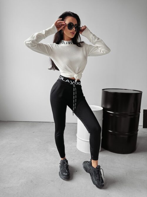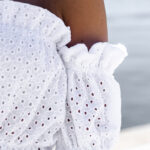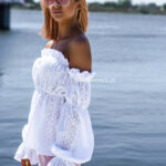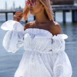 Z elastycznym dekoltem pięknie eksponującym ramiona, wykończonym gumką.