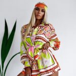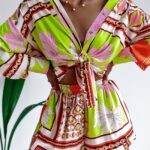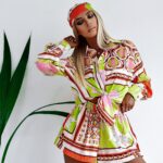 Jeśli szukasz ciekawej stylizacji na ciepłe dni to przychodzimy do Ciebie z idealną propozycją. Komplet Colorful Satin, marki OlaVoga będzie świetną bazą do wielu stylizacji różnego rodzaju. Koszula na długi rękaw i krótkie spodenki idealnie sprawdzą się do eleganckich, letnich stylizacji ze szpilkami lub sandałkami na obcasie oraz tych sportowych i codziennych. Koszula zapinana na guziki wzdłuż, dzięki czemu możemy dopasować wysokość dekoltu do swoich potrzeb. Dekolt zakończony jest kołnierzykiem. Spodenki w pasie posiadają gumkę, co zapewni komfort w noszeniu. Piękne zestawienie kolorystyczne i print sprawi, że nasz komplet skradnie od razu Twoje serce.To zdecydowanie świetny wybór na wiele okazji.