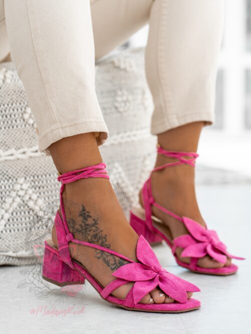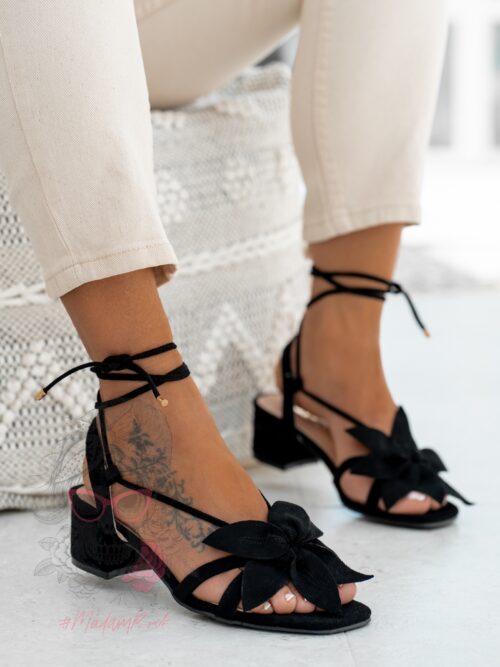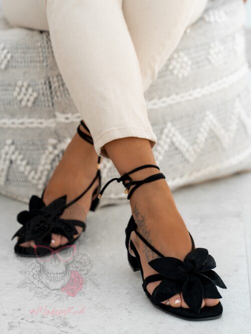 Odkryte sandałki Madam Miley Flowers wykonane z wysokogatunkowego zamszu na gumowej, antypoślizgowej podeszwie. Buty wiązane wokół kostki, na niskim słupku, który pozwala optycznie wysmuklić nogi. Na przodzie zamszowy kwiat w kolorze butów. Musisz je mieć!