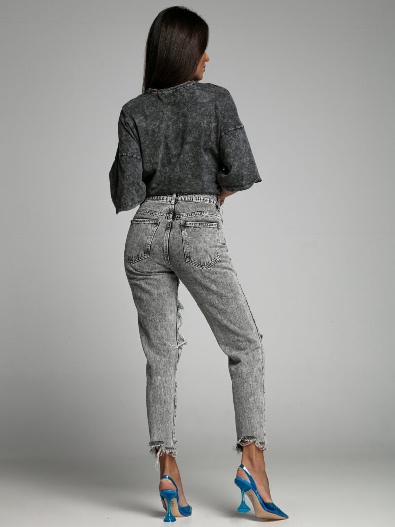 Kolejną naszą propozycją są spodnie Gronk w kolorze szarym. Z długą, luźną nogawką i nieco podwyższonym stanem. Zapinane na zamek oraz guzik na przodzie. Posiadają standardowe rozmieszczenie kieszeni. Szczególnego uroku dodają im dziury zdobiące obie nogawki.