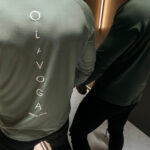 Subtelne logo OLAVOGA i pionowy branding na plecach