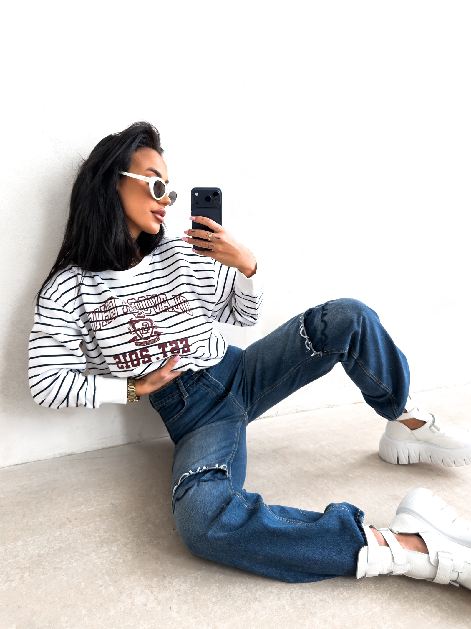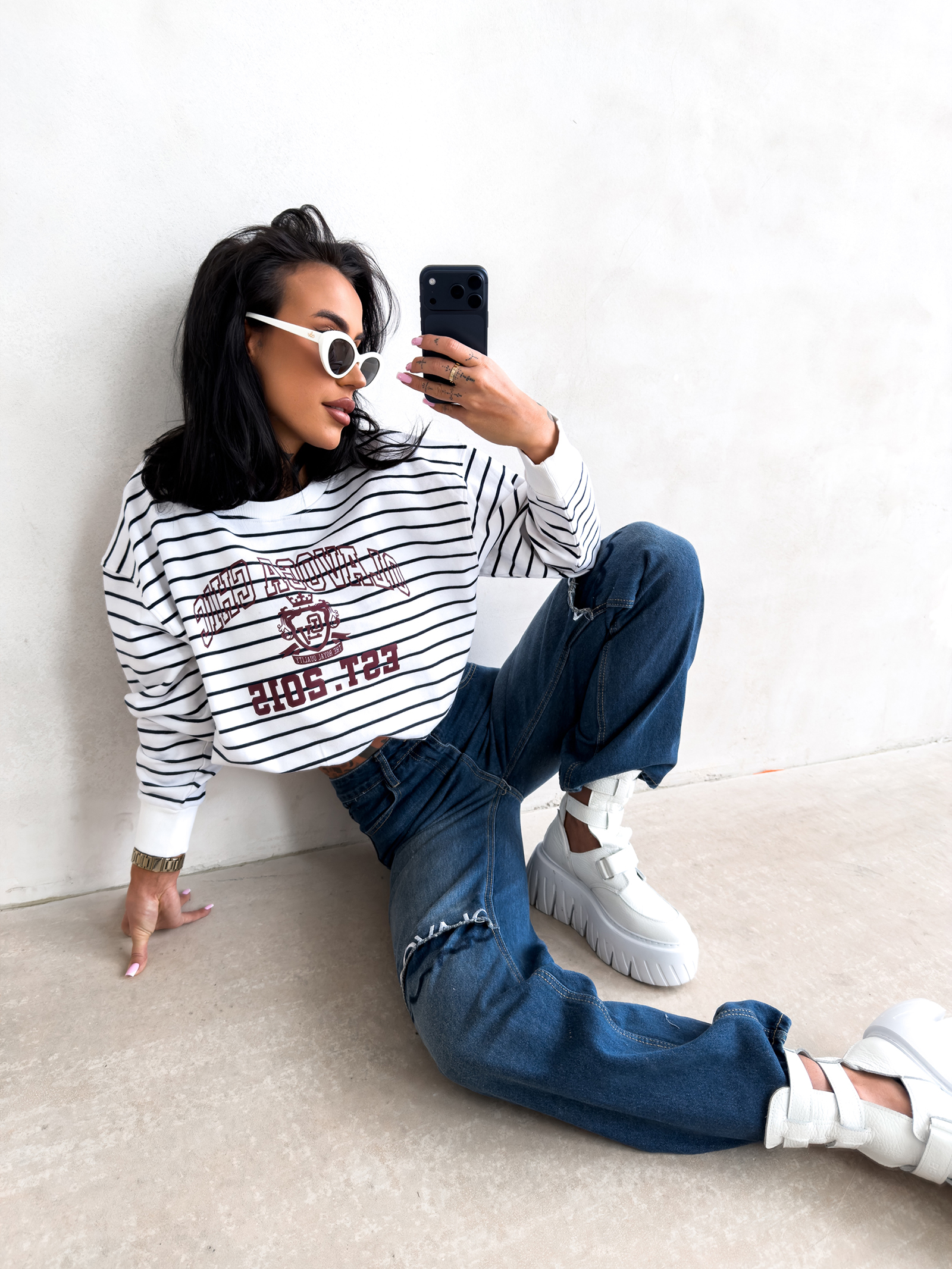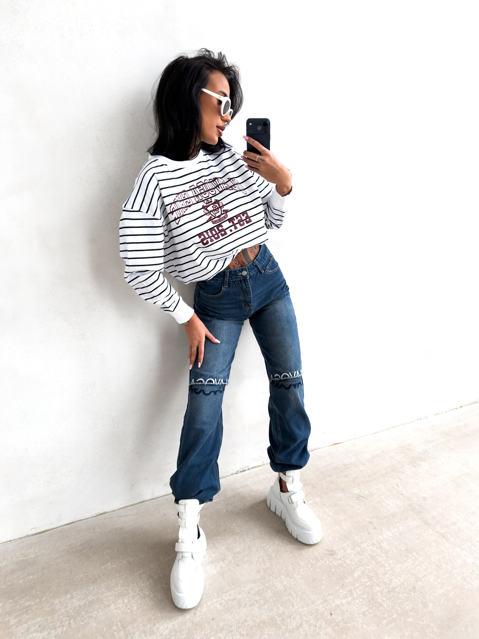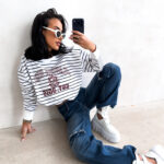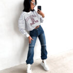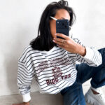 - Ponadczasowy motyw pasów pozwala na łatwe łączenie bluzy z jeansami, legginsami lub gładkimi spódnicami.