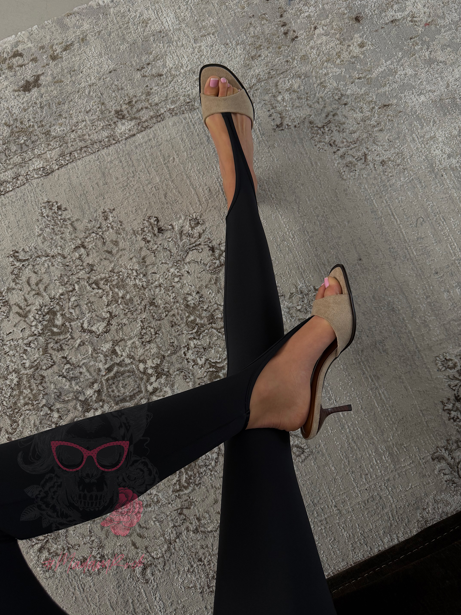 Buty osadzone są na szpilce o komfortowej, niezbyt wysokiej wysokości, która subtelnie wysmukla sylwetkę, jednocześnie zapewniając wygodę noszenia. Kwadratowy czubek nadaje klapkom nowoczesnego charakteru i wpisuje się w aktualne trendy, zachowując przy tym klasyczny styl.