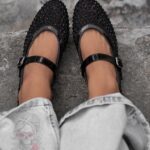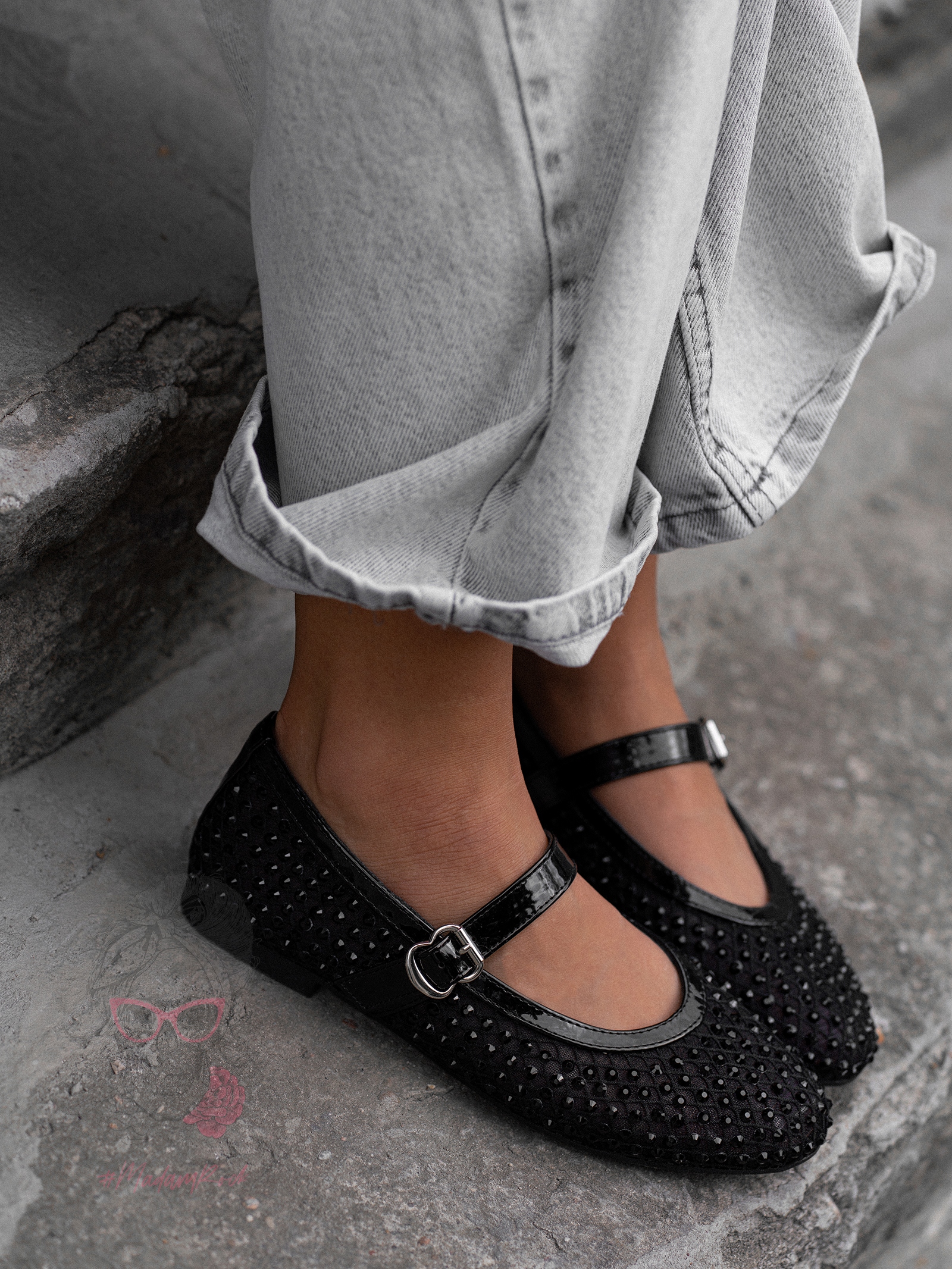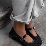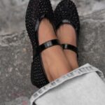 Damskie balerinki Madam Zakse na płaskiej podeszwie to elegancka i efektowna propozycja dla kobiet ceniących subtelne zdobienia i lekkość formy. Wykonane z transparentnej siateczki oraz delikatnego tworzywa, wyróżniają się wyjątkową fakturą i przewiewnością, idealną na cieplejsze dni. Cała powierzchnia buta ozdobiona została czarnymi, mieniącymi się cyrkoniami, które pięknie odbijają światło i nadają całości biżuteryjnego charakteru. Model zapinany jest na pasek z klamrą, który nie tylko stabilizuje stopę, ale również stanowi elegancki detal. To balerinki, które łączą lekkość, błysk i kobiecy wdzięk, doskonałe zarówno na co dzień, jak i na wyjątkowe okazje.