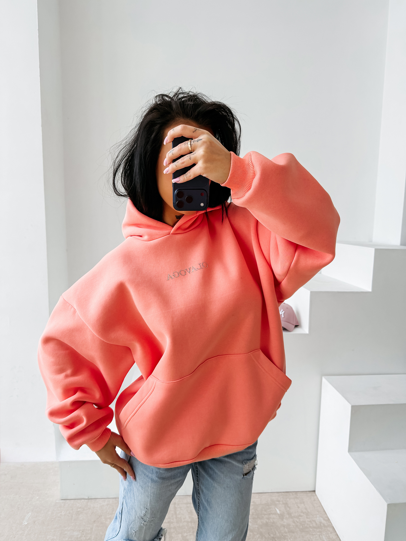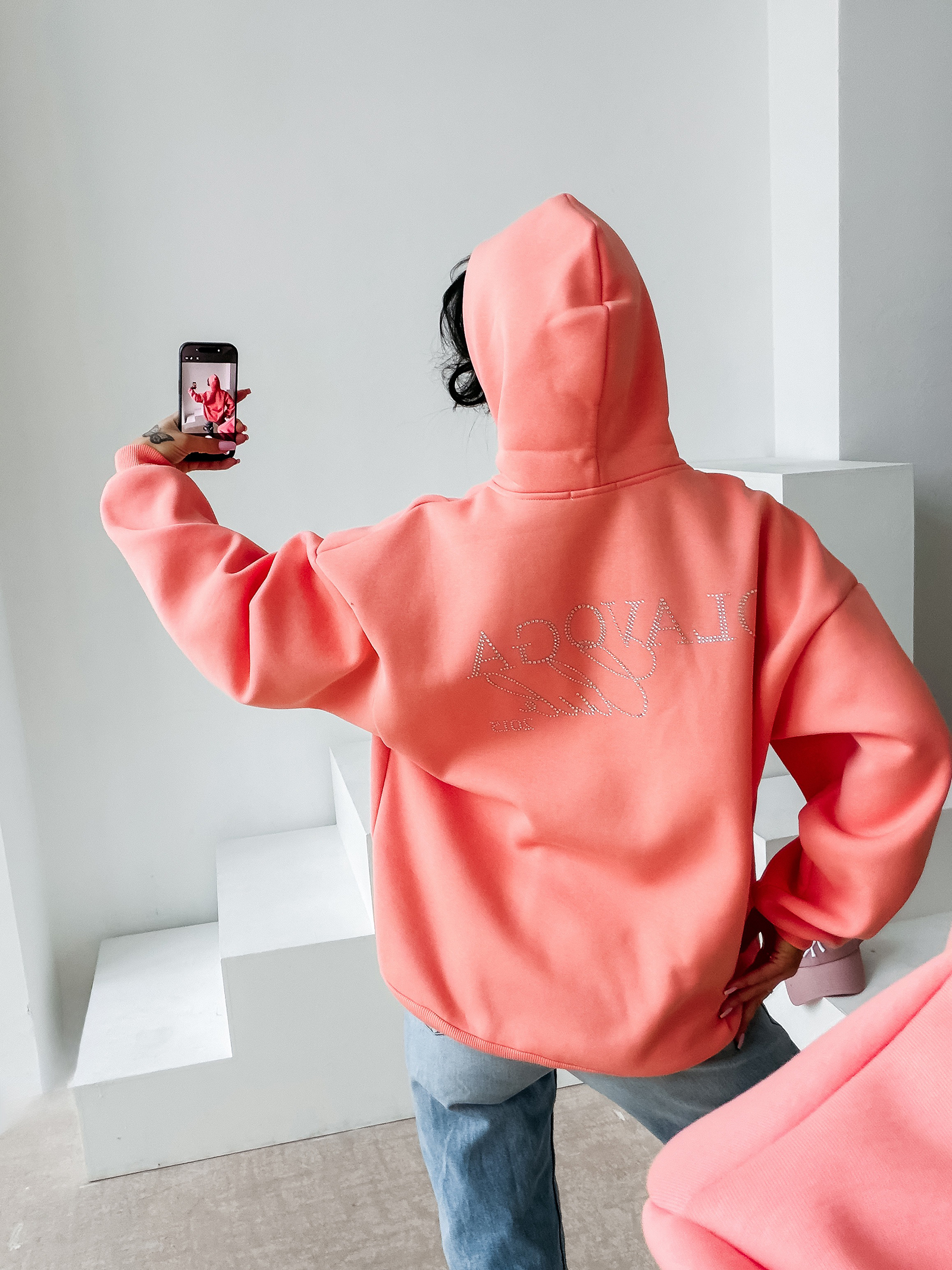 Tył to prawdziwy game changer. Aplikacja z kryształków tworząca napis OLAVOGA Club 2015 nadaje całości wyrazistości i wprowadza modowy błysk. To detal, który robi ogromne wrażenie i sprawia, że bluza wyróżnia się w tłumie.
