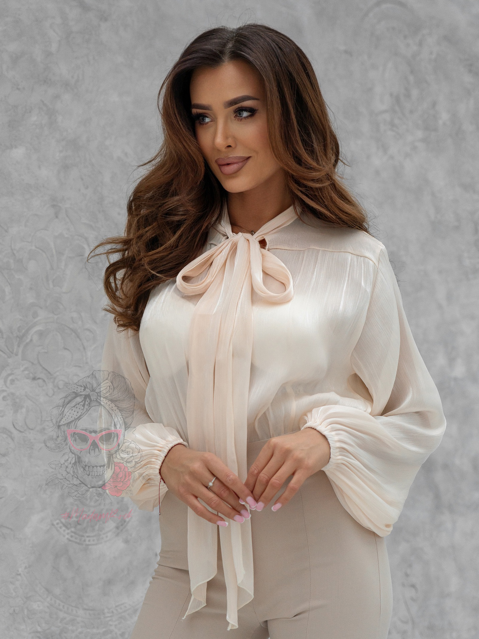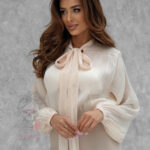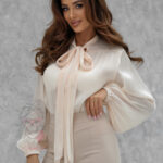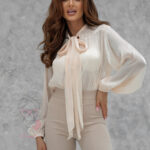 Wysoka stójka została wykończona długim wiązaniem przy szyi, które możesz ułożyć w kokardę lub puścić luźno, tworząc bardziej nonszalancki efekt. Ten detal przyciąga spojrzenia i sprawia, że body wygląda niezwykle szykownie.