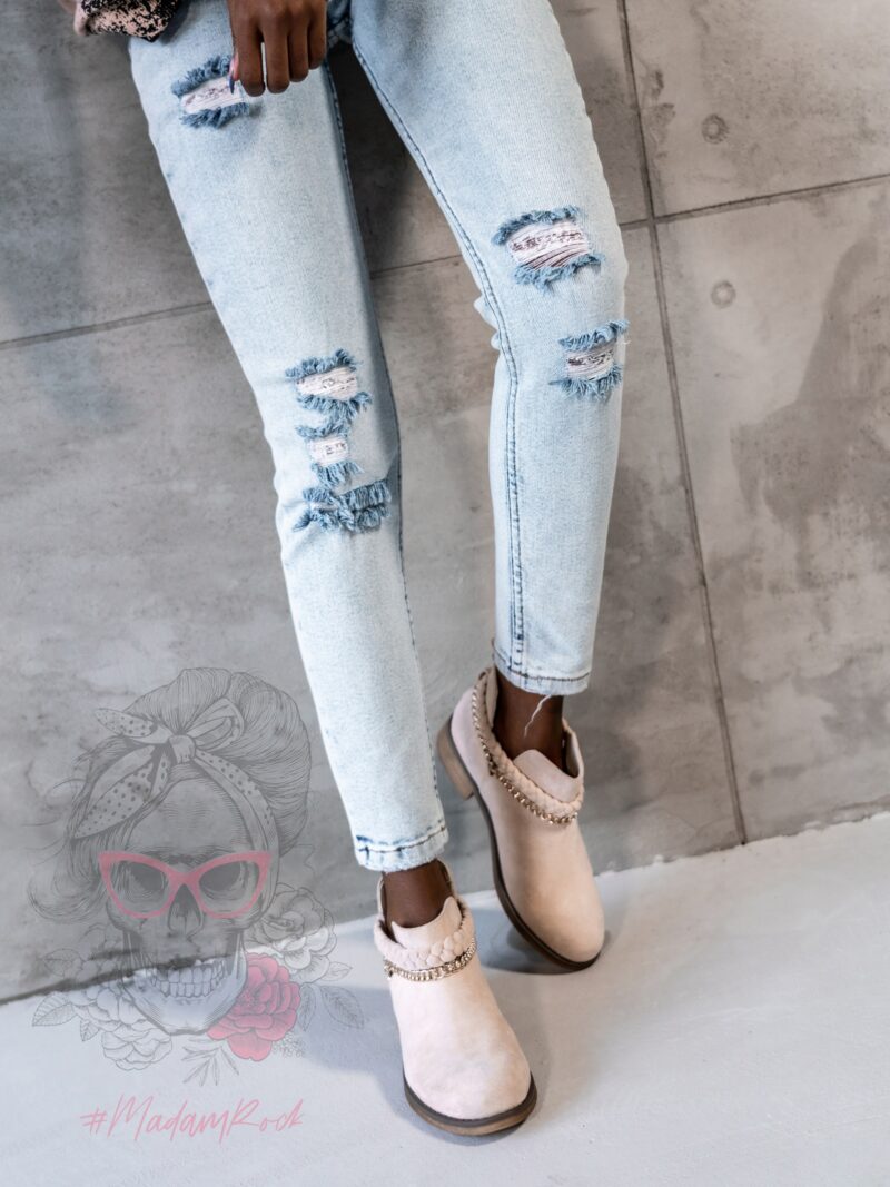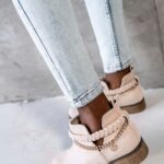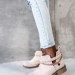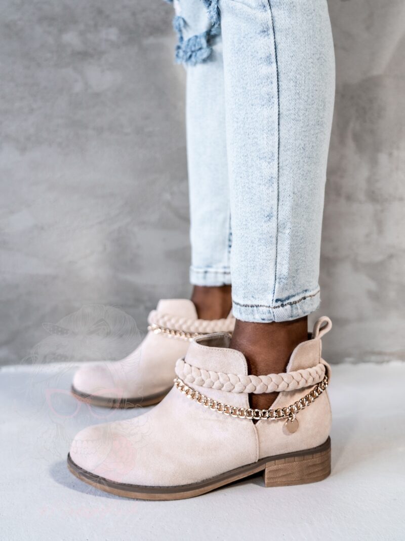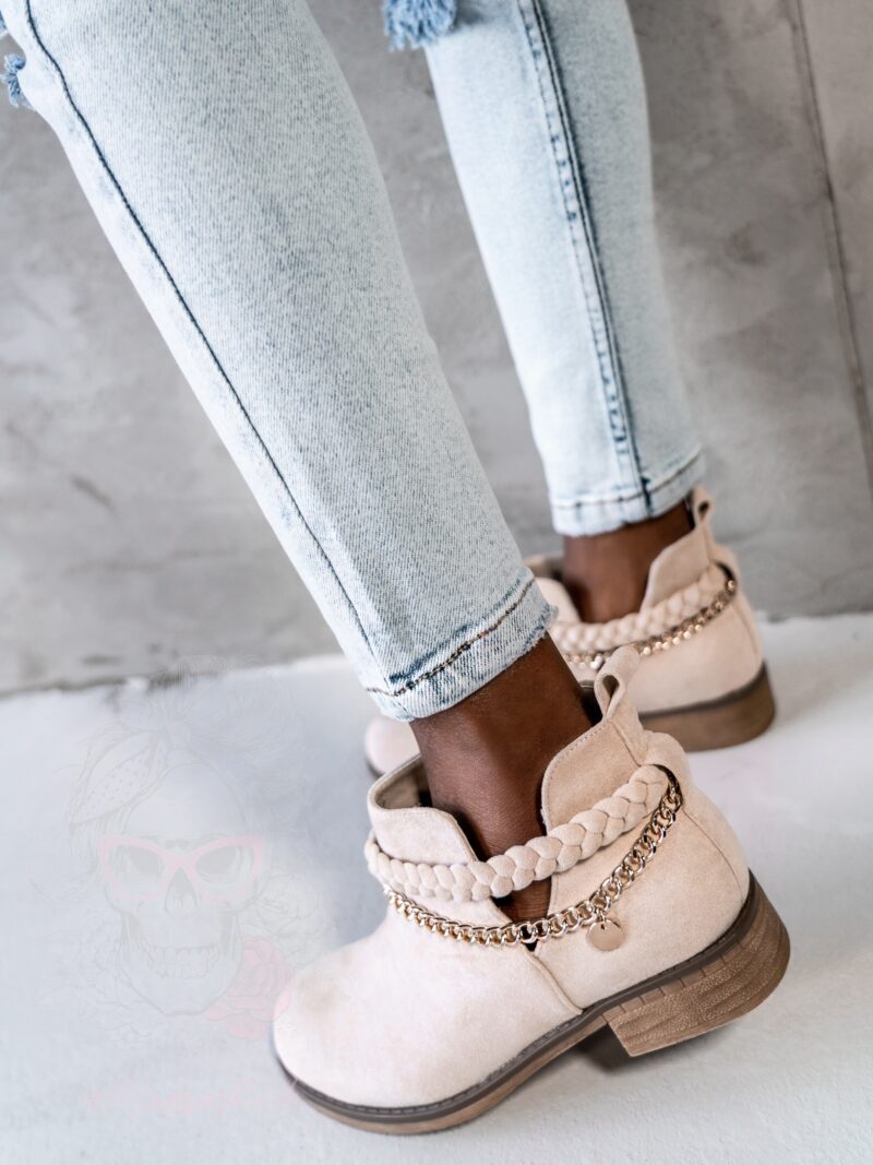 Naszą kolejną propozycją są botki Madam Oest. Wykonane z delikatnego i przyjemnego w dotyku zamszu ekologicznego w jasnobeżowym kolorze. Na gumowej, antypoślizgowej podeszwie z podwyższeniem pod piętą. Model bez zamka, lecz z efektownymi wycięciami w cholewce ułatwiającymi zakładanie obuwia. Szczególnego uroku dodaje złoty łańcuszek oplatający cholewkę i warkocz w kolorze obuwia. Wnętrze nieocieplane, wyłożone tkaniną.