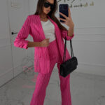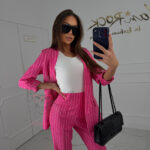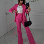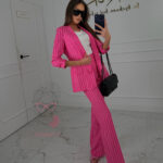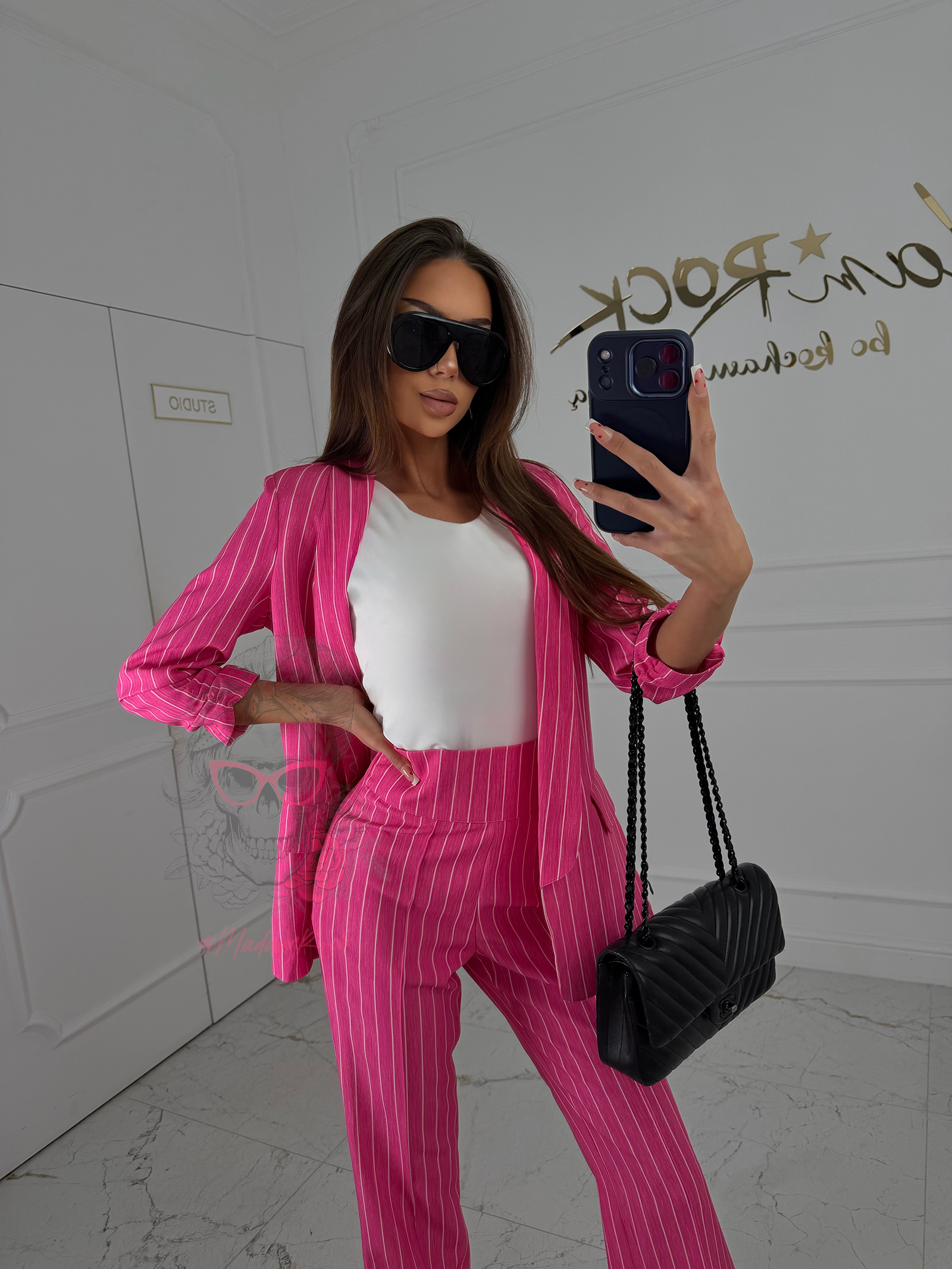 Komplet damski Slipps to idealny wybór na wyjątkowe okazje. Wykonany z wysokogatunkowego, elastycznego materiału. Garnitur w kolorze różowym w paski. Marynarka o klasycznym kroju z rękawem 3/4 i kołnierzem. Spodnie z wysokim stanem i rozszerzanymi nogawkami. Model zapinany na suwak. Idealny do szpilek!