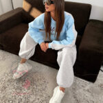 Spodnie dresowe w tym komplecie zachwycają szerokim krojem typu ballon, który nadaje sylwetce modowego luzu. Elastyczna guma w talii gwarantuje idealne dopasowanie i wygodę noszenia, a dwie praktyczne kieszenie zwiększają funkcjonalność. Nogawki zakończone są ściągaczami z regulacją, dzięki czemu możesz nosić je luźno lub bardziej dopasowane – dokładnie tak, jak lubisz.