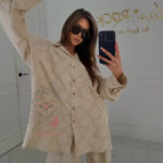 Góra zestawu to dłuższa koszula o luźnym, oversize’owym fasonie. Klasyczny kołnierzyk podkreśla elegancki charakter modelu, a długie, swobodne rękawy zakończone mankietami zapinanymi na guzik dodają mu szyku. Koszula zapinana jest z przodu na rząd guzików, co pozwala nosić ją zarówno tradycyjnie, jak i bardziej nonszalancko – lekko rozpiętą lub narzuconą na top.