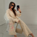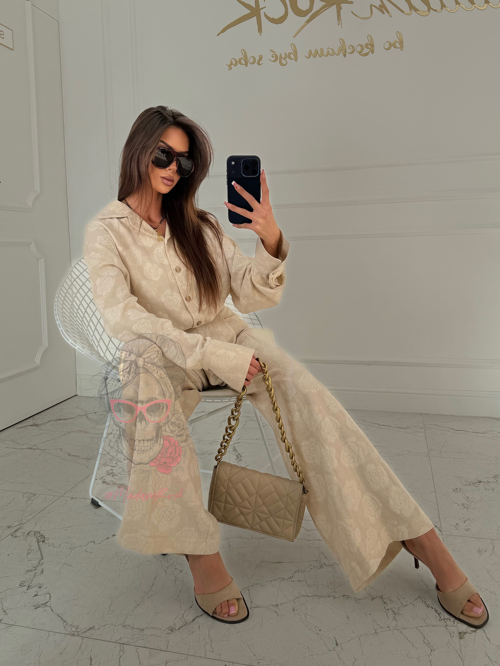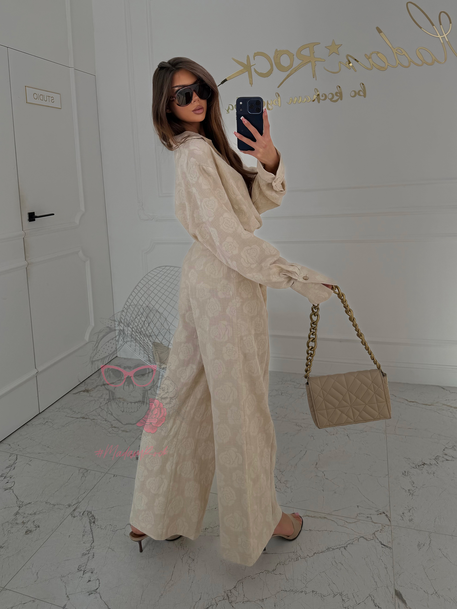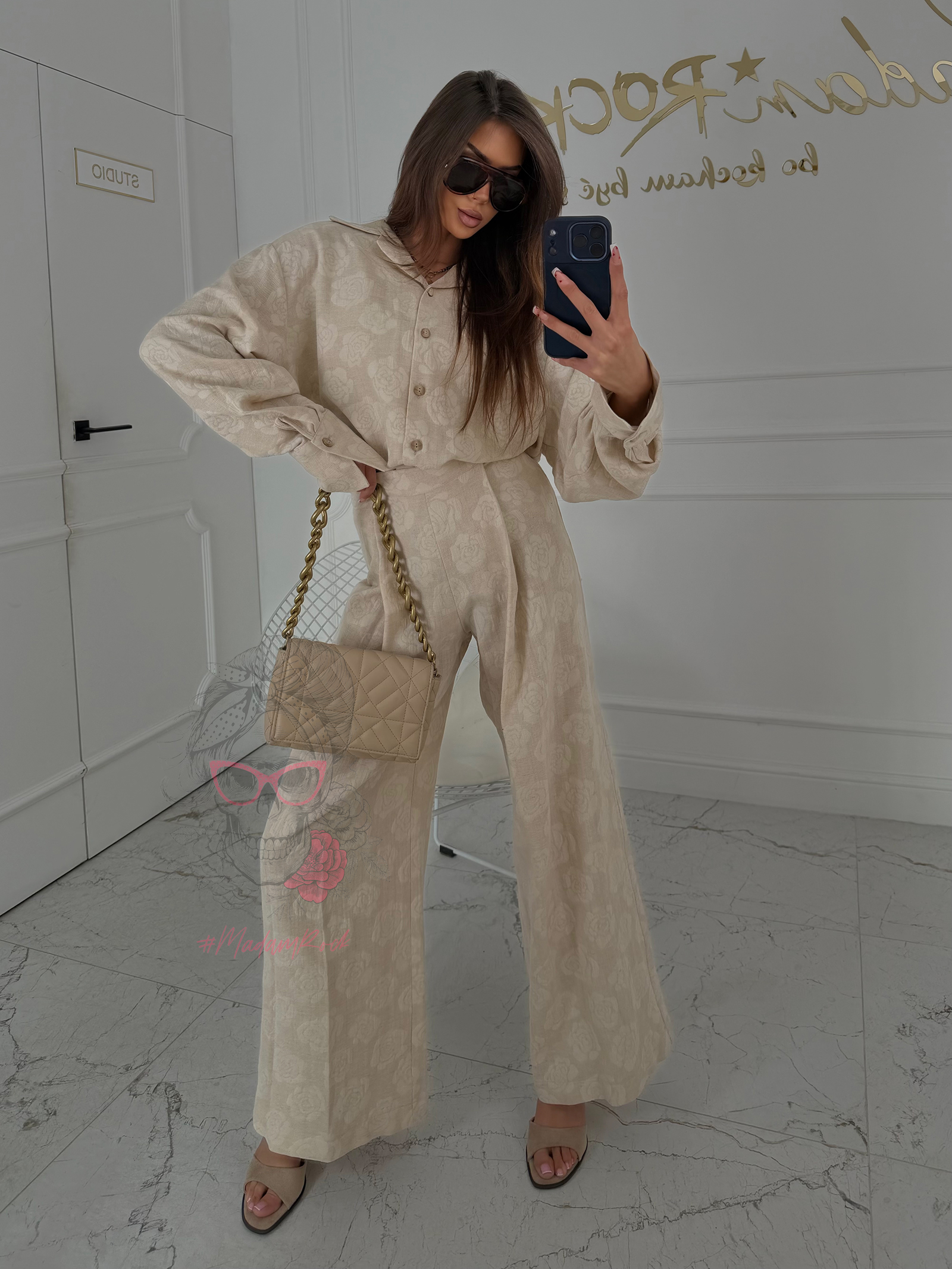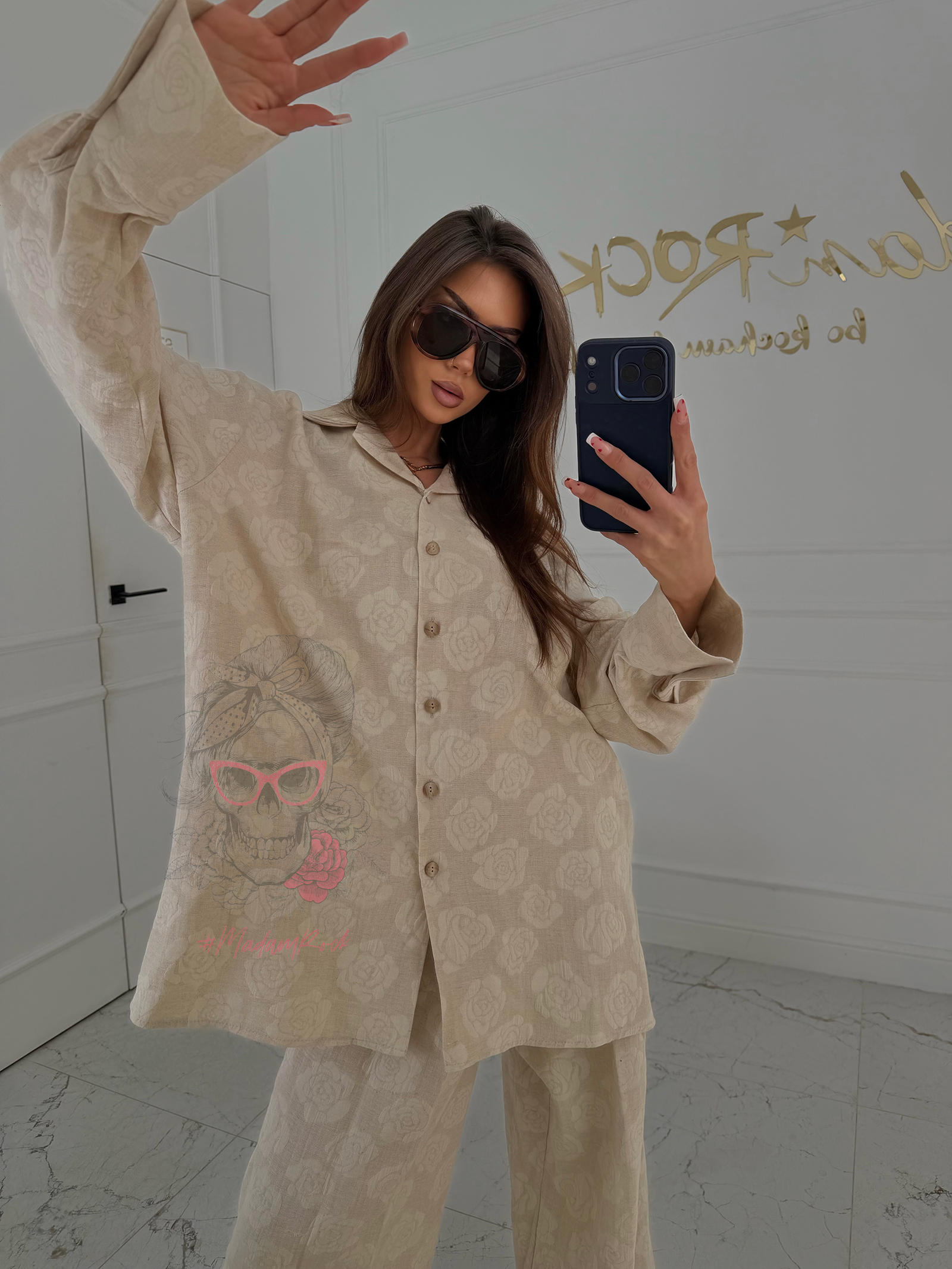 Komplet Victoria Portano to idealne połączenie swobody, elegancji i ponadczasowego charakteru. Wykonany z miękkiego, przewiewnego lnu, pięknie układa się na sylwetce, zapewniając komfort nawet w cieplejsze dni. Tkanina jest lekka, ale jednocześnie mięsista, dzięki czemu całość prezentuje się szlachetnie i stylowo. Delikatny wzór w róże dodaje romantycznego wyrazu i sprawia, że komplet przyciąga spojrzenia.