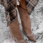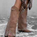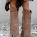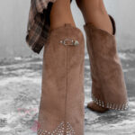 Kozaki damskie w stylu kowbojki Madam Wander to połączenie klasyki westernowej z nowoczesnym designem. Model wsuwany, z wysoką cholewką i noskiem w szpic, zapewnia stylowy i elegancki wygląd. Kozaki posiadają ukryty, krótki suwak, który sprawia, że zakładanie i zdejmowanie obuwia jest szybkie oraz wygodne. Dzięki temu praktycznemu rozwiązaniu buty zachowują elegancki wygląd, a jednocześnie są bardzo funkcjonalne. Górna część cholewki ma asymetryczny fason i została ozdobiona sprzączką oraz delikatnie opadającym materiałem wykończonym ciemnosrebrnymi dżetami, co nadaje butom charakteru i unikalnego stylu.
