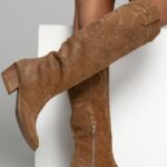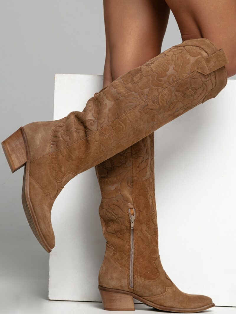 Wyjątkowe kozaki damskie Madam Balcer. Wykonane z zamszu naturalnego w kolorze karmelowym. Model na gumowej, antypoślizgowej podeszwie i niewielkim obcasie, który zapewnia wygodę użytkowania. Z noskiem w szpic, który optycznie wysmukli Twoją stopę. Model z długą, luźną cholewką posiadającą wycięcia na górze, która zdobiona jest efektownym, kwiecistym wzorem. Kozaki wyposażone są w krótki suwak od wewnętrznej strony, który ułatwia zakładanie. Nie są ocieplane, mają skórzaną wkładkę wewnętrzną. Kozaki są niezwykle efektowne. Raz założone staną się Twoimi ulubionymi butami!