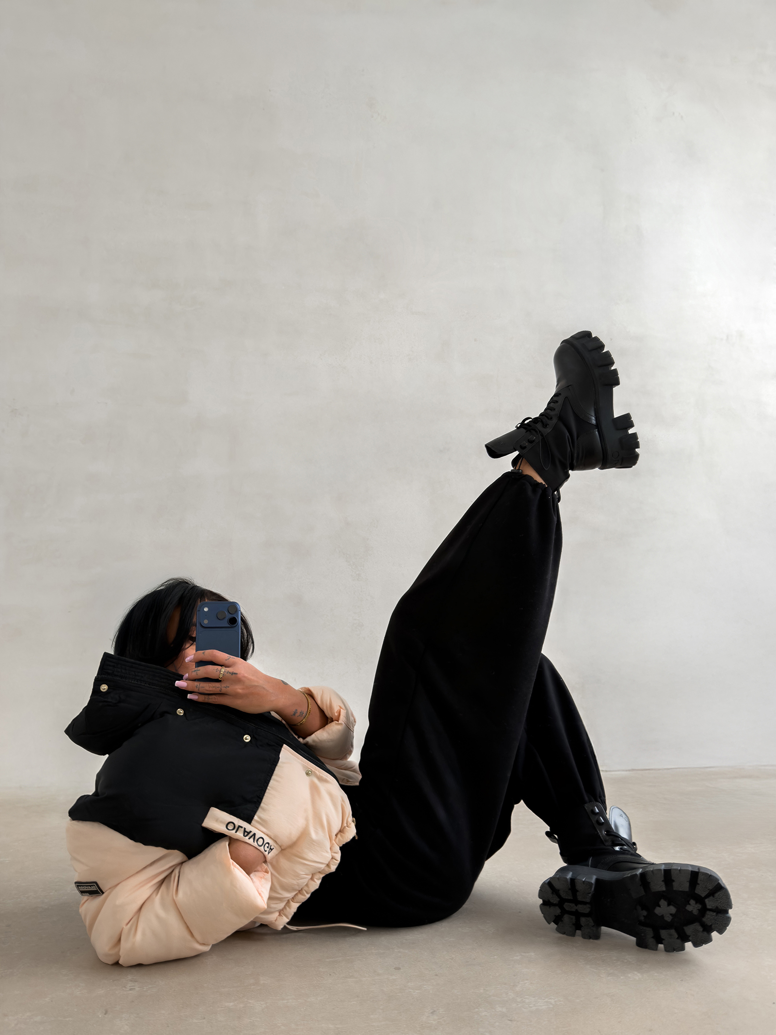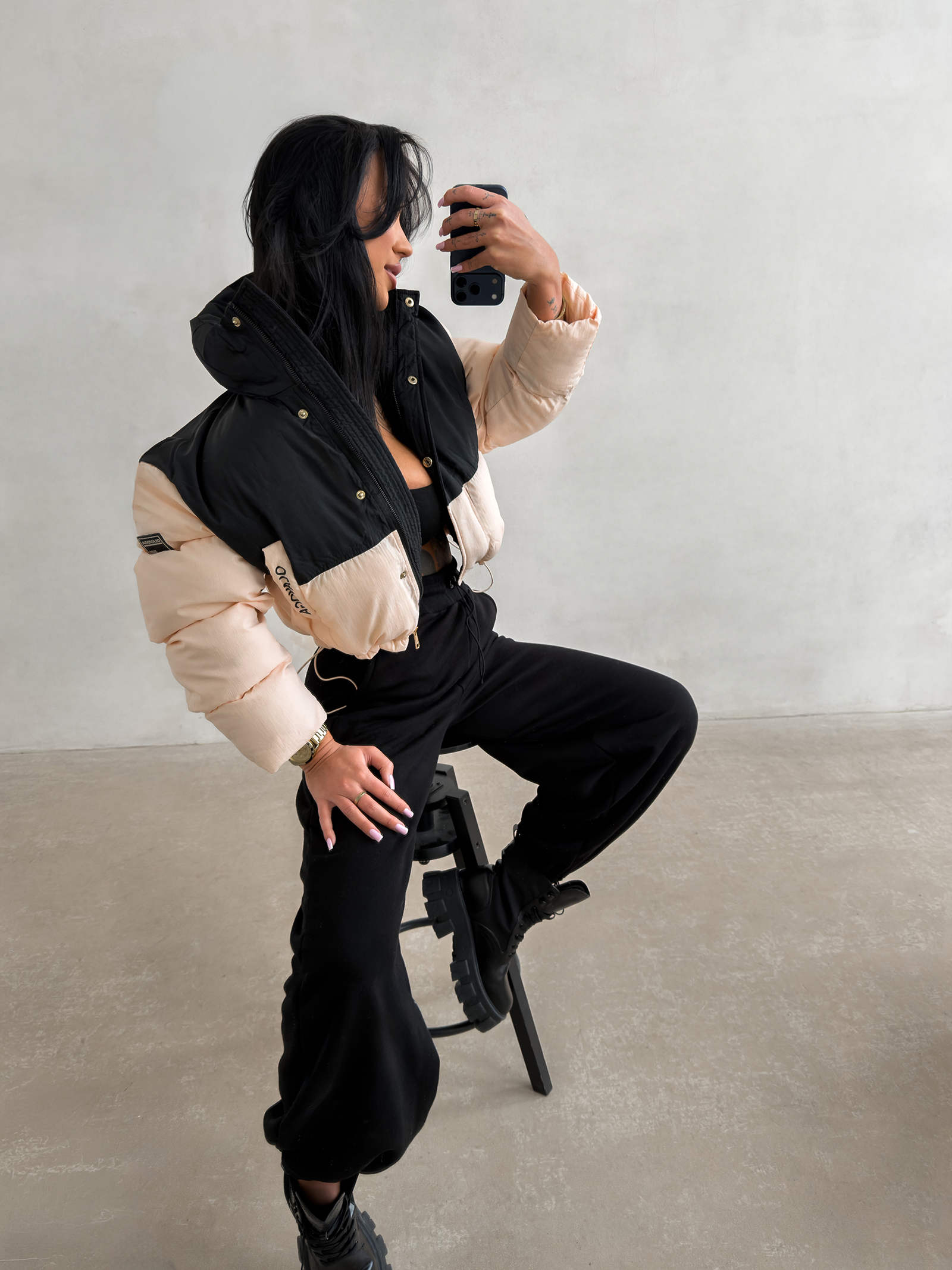 - Logowana taśma na rękawach stanowi unikalny detal dekoracyjny, który podkreśla prestiżowy charakter marki OLAVOGA.