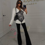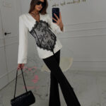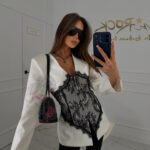 Taliowany fason wspaniale modeluje sylwetkę, a największą uwagę przyciąga kontrastowa, koronkowa wstawka umieszczona w linii talii. Tworzy ona efekt eleganckiego pasa, który optycznie wysmukla figurę i dodaje stylizacji lekkości oraz subtelnej zmysłowości. To detal, który sprawia, że marynarka wyróżnia się na tle klasycznych modeli.