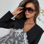 Taliowany fason wspaniale modeluje sylwetkę, a największą uwagę przyciąga kontrastowa, koronkowa wstawka umieszczona w linii talii. Tworzy ona efekt eleganckiego pasa, który optycznie wysmukla figurę i dodaje stylizacji lekkości oraz subtelnej zmysłowości. To detal, który sprawia, że marynarka wyróżnia się na tle klasycznych modeli.