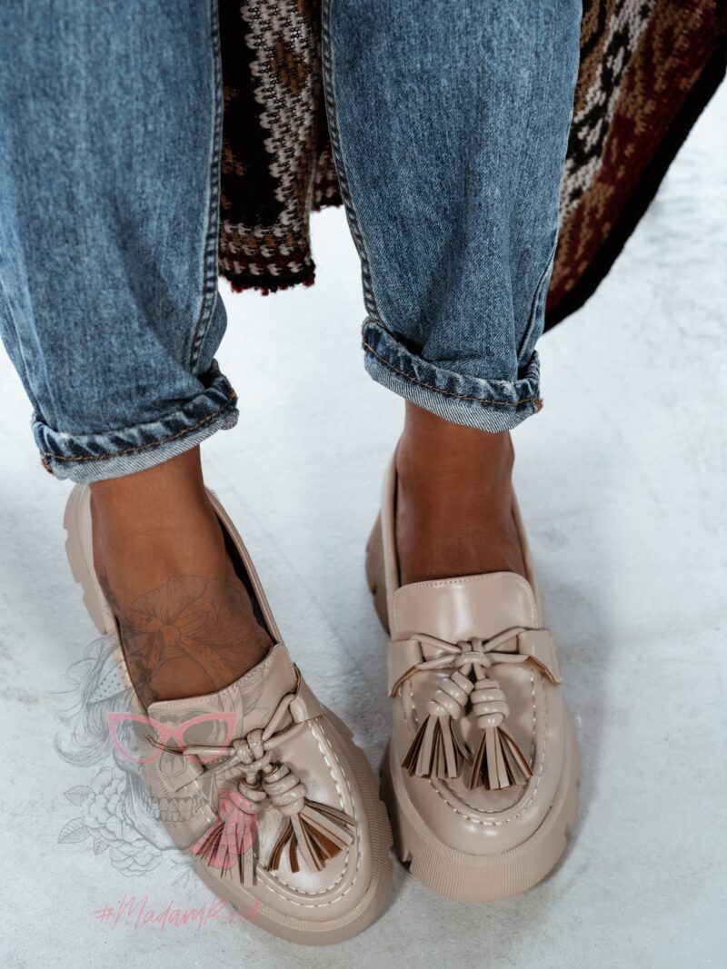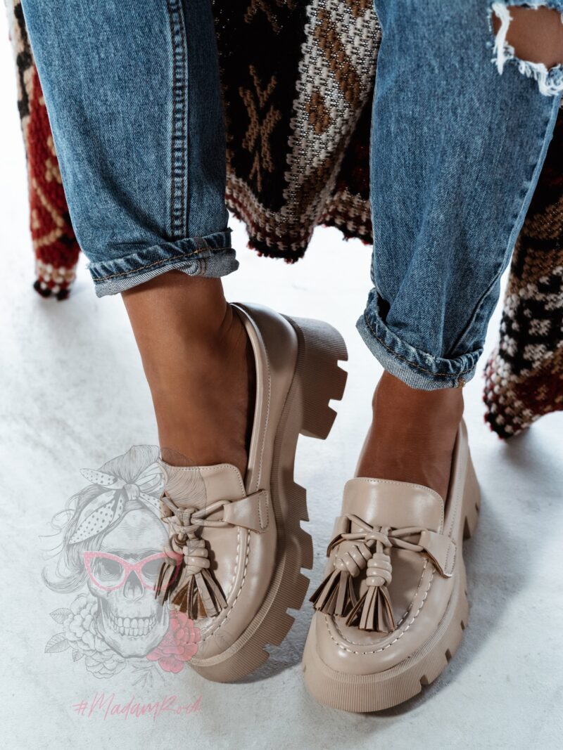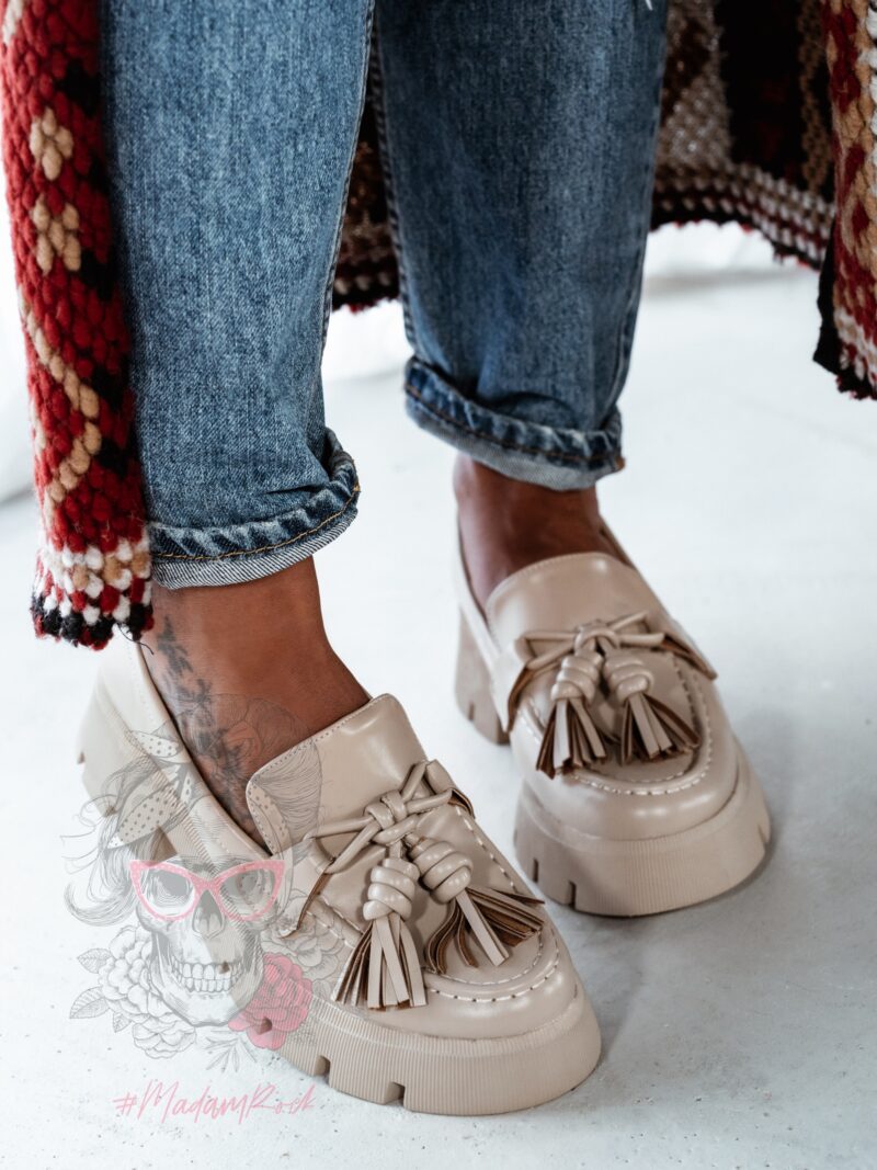 Mokasyny na podwyższonej platformie to niebywały hit w tym sezonie, który wpasowuje się w wiele stylizacji. Nasz model Roed w stonowanych odcieniach brązu i beżu z pewnością dopełni nie jedną Twoją stylizację. Wysoka platforma, która dodaje całości charakteru i frędzle akcentują całość podkreślając skórzane wykończenie. To idealny model na dla kobiet, które uwielbiają podkreślić swoją stylizację pięknym obuwiem.