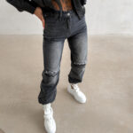 - Surowe wykończenie przeszyć na wysokości kolan nadaje jeansom odważny, rockowy charakter zgodny z najnowszymi trendami.