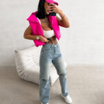 - Surowe wykończenie przeszyć na wysokości kolan nadaje jeansom odważny, rockowy charakter zgodny z najnowszymi trendami.