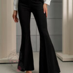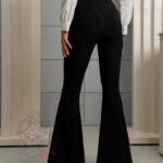Spodnie mają dopracowany, wysoki stan, który podkreśla talię i optycznie wydłuża nogi. Z tyłu wszyta została elastyczna guma, która gwarantuje idealne dopasowanie i komfort noszenia przez cały dzień. Długie, rozszerzane nogawki w fasonie dzwonów wysmuklają linię nóg, nadając całości elegancji i modowego charakteru. Dodatkowo kant z przodu subtelnie podkreśla ich formalny styl, a zapinanie na ukryty suwak po boku zachowuje czystość formy.