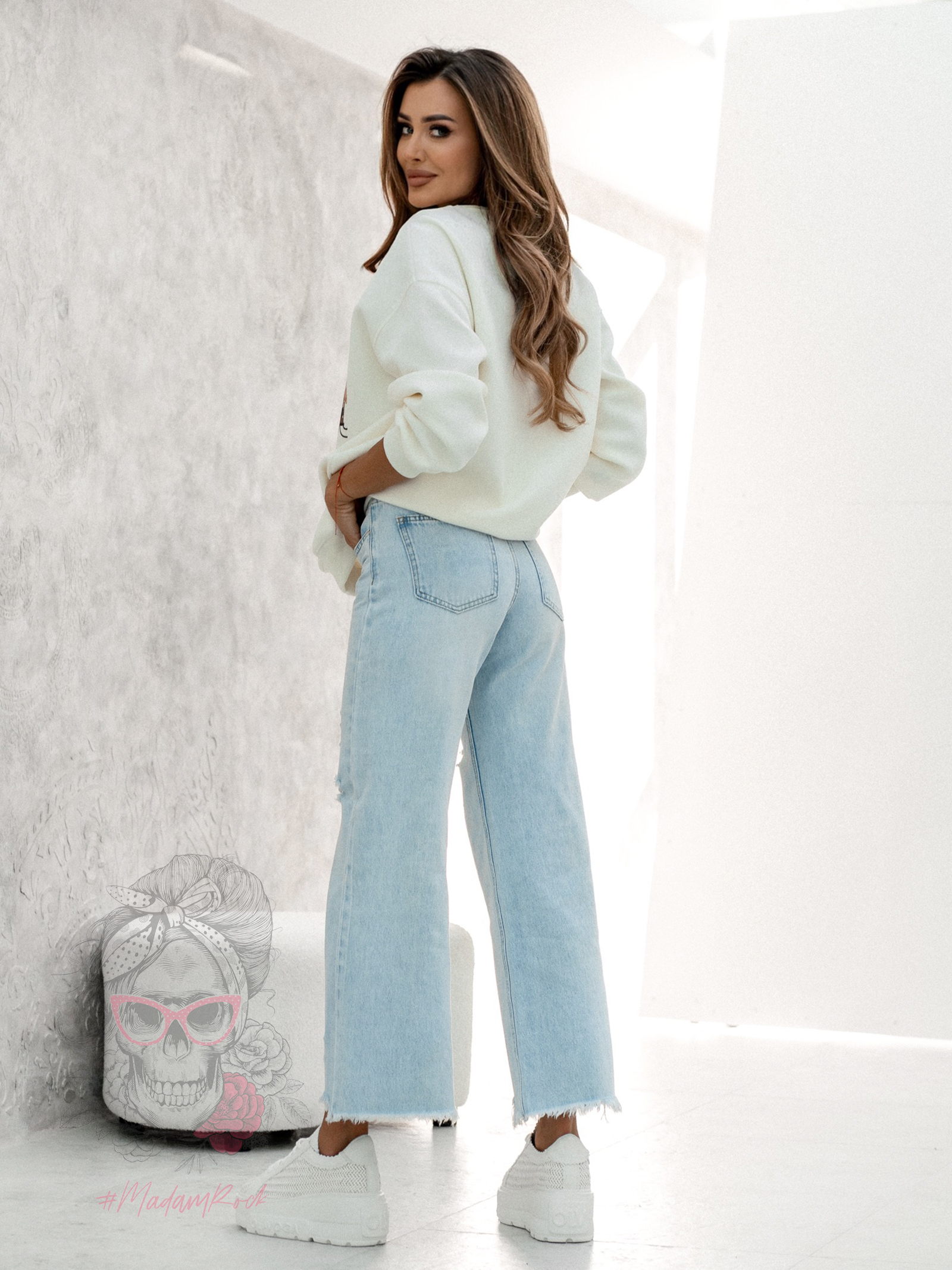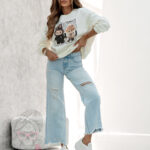 Model wyróżnia się surowym wykończeniem nogawek, przetarciami i subtelnymi dziurami z przodu, co nadaje spodniom modnego, vintage’owego sznytu. Kieszenie z przodu i z tyłu oraz zapięcie na guzik i suwak łączą funkcjonalność z komfortem. Idealne do sneakersów, botków i casualowych topów – spodnie Fikus to must-have dla fanek miejskiego, modowego luzu.