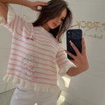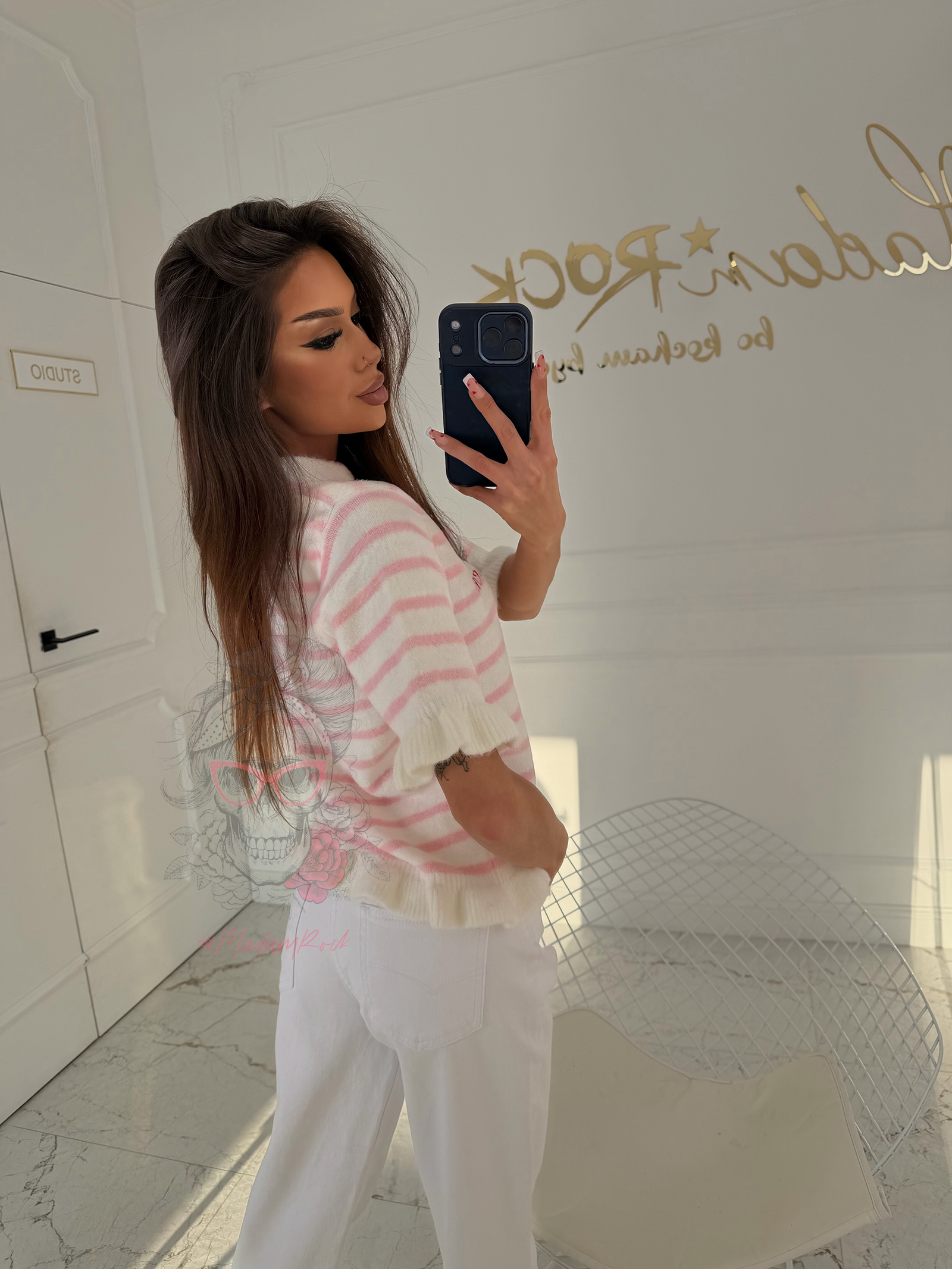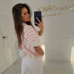 Krótki rękaw zakończony falbanką wprowadza lekko romantyczny akcent i przełamuje klasyczny charakter swetra. Taki sam detal pojawia się również u dołu, dzięki czemu całość wygląda spójnie i bardzo stylowo.