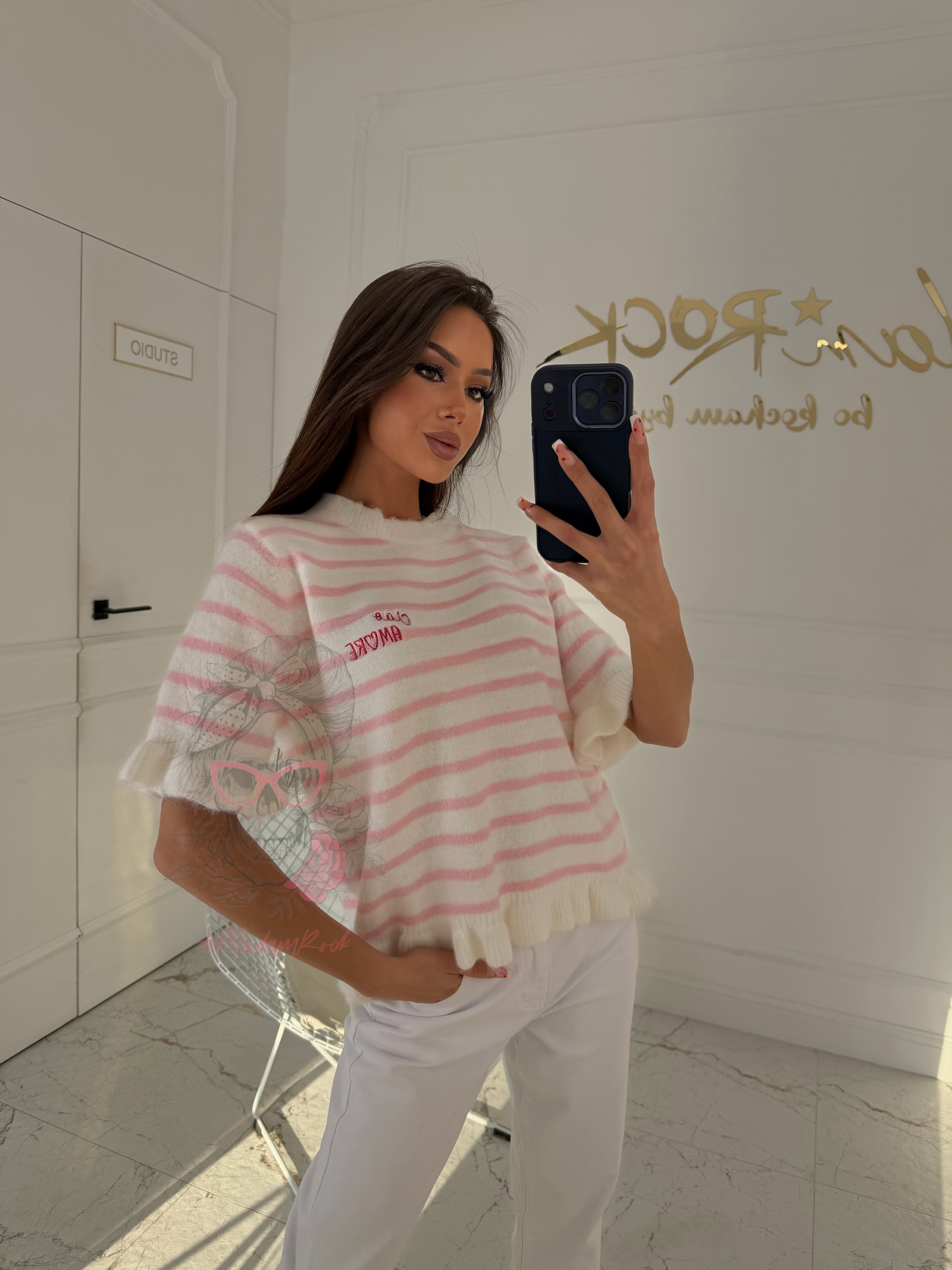 Po lewej stronie znajduje się haftowany napis „ciao amore”, który nadaje sweterkowi włoskiego klimatu i dziewczęcej lekkości. To drobny element, ale właśnie on sprawia, że model wyróżnia się i przyciąga spojrzenia.