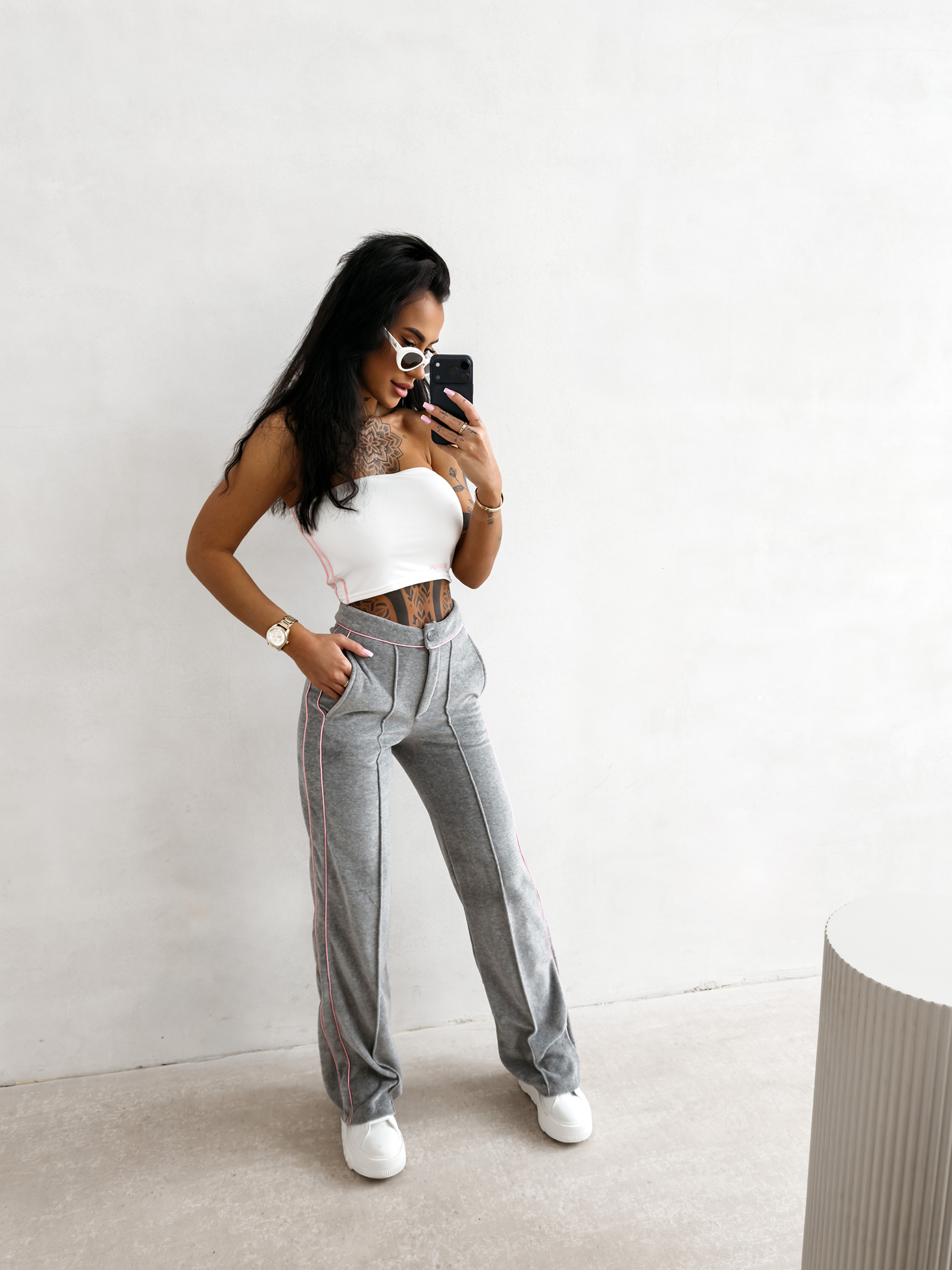 - Kontrastowe lampasy po bokach optycznie modelują sylwetkę i dodają całości nowoczesnego, sportowego sznytu w stylu luksusowym.