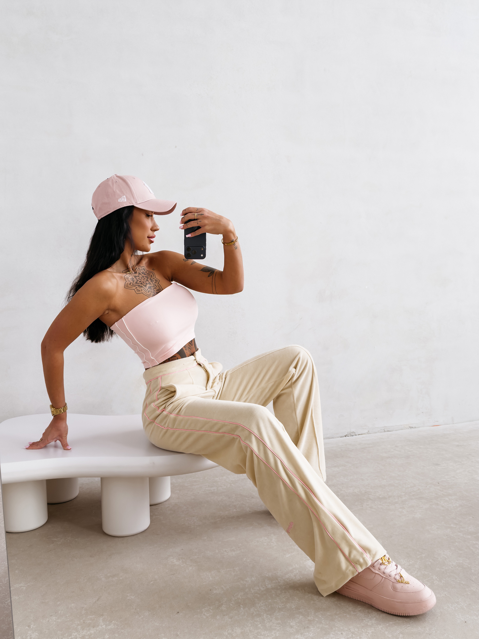 - Kontrastowe lampasy po bokach optycznie modelują sylwetkę i dodają całości nowoczesnego, sportowego sznytu w stylu luksusowym.