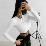 Długi rękaw oraz zabudowany dekolt równoważą krótki krój, tworząc harmonijną, bardzo kobiecą formę. To przemyślane połączenie sprawia, że top jest jednocześnie subtelny i wyrazisty.