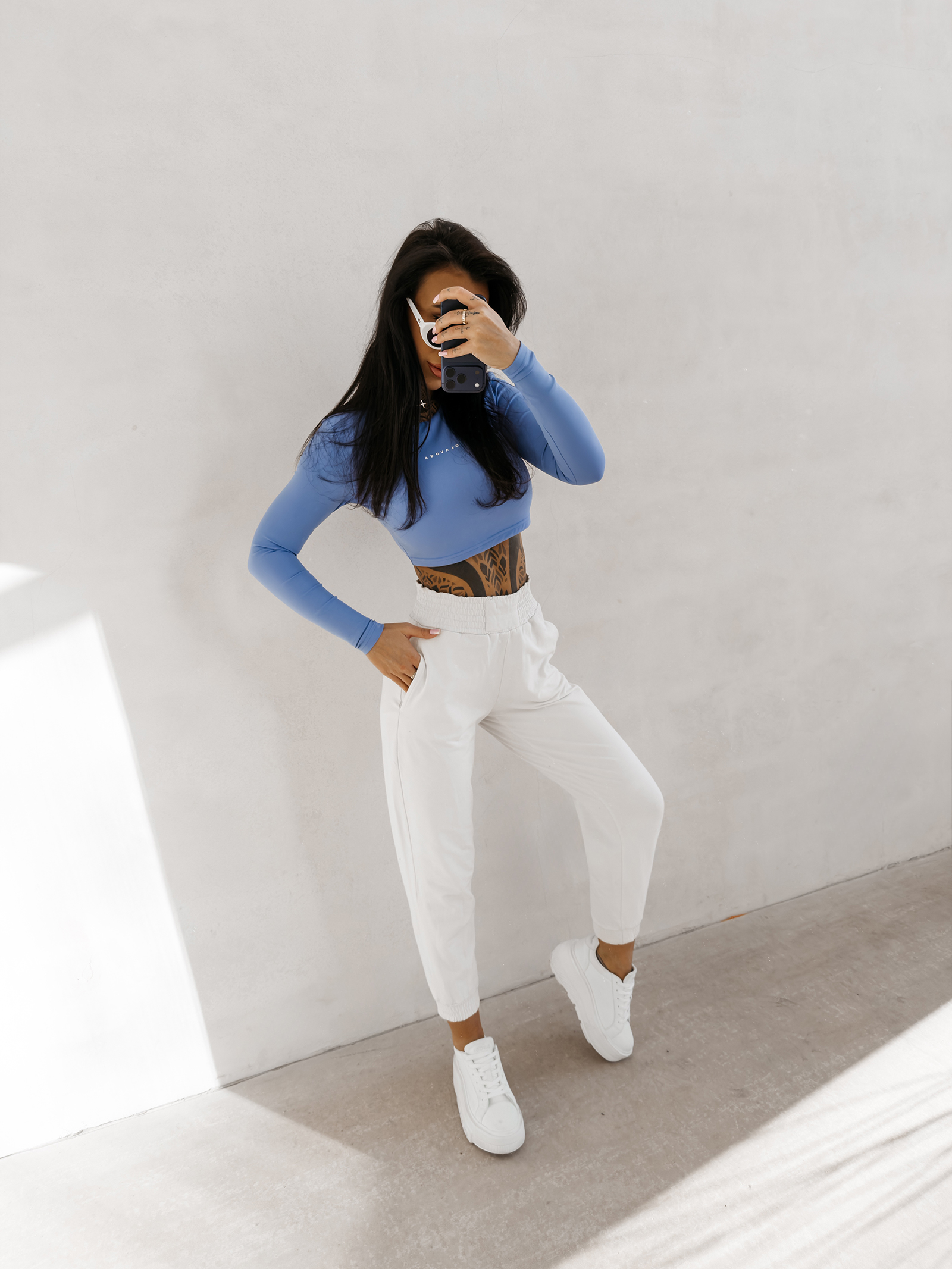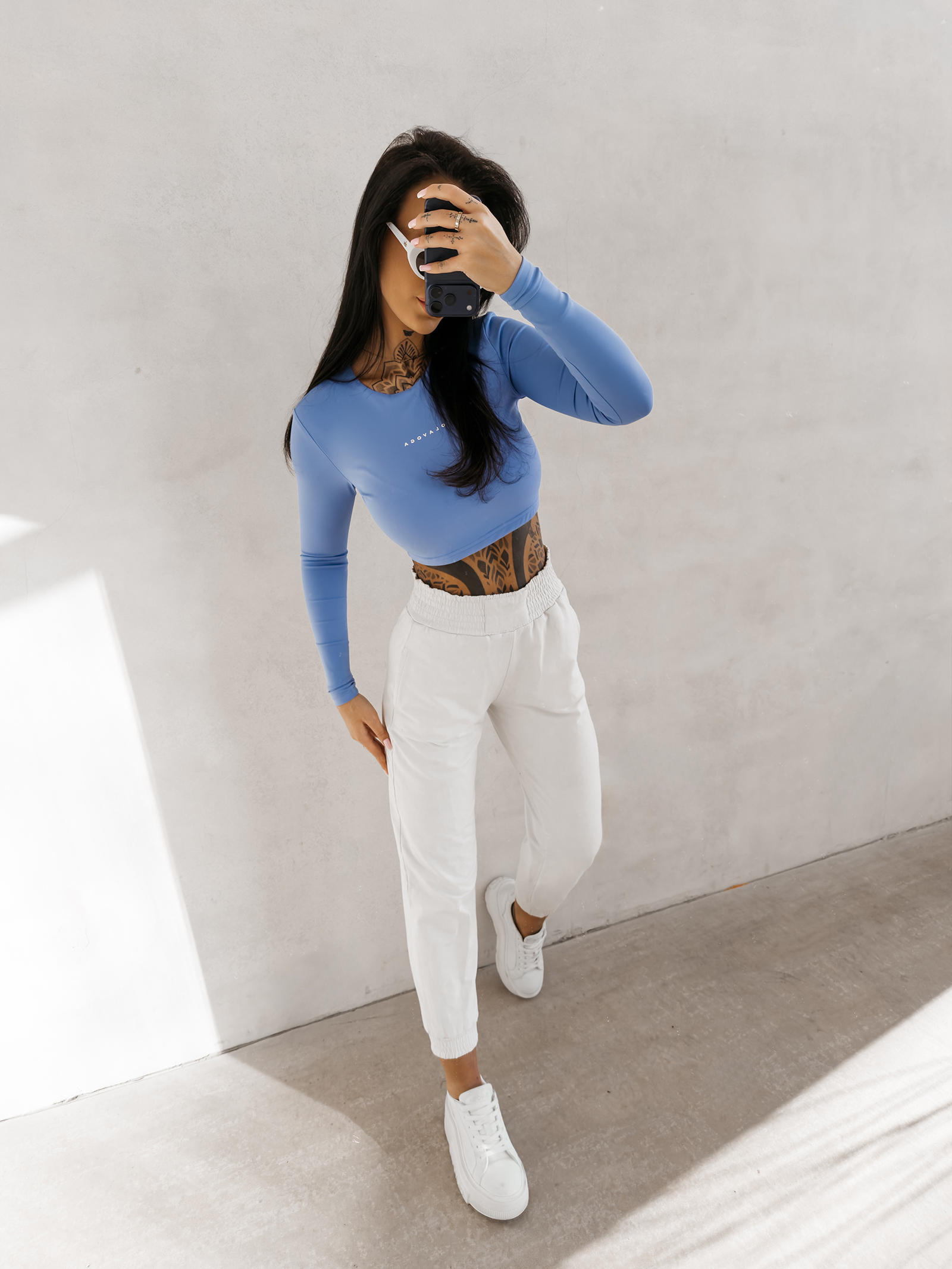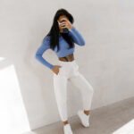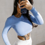 Długi rękaw oraz zabudowany dekolt równoważą krótki krój, tworząc harmonijną, bardzo kobiecą formę. To przemyślane połączenie sprawia, że top jest jednocześnie subtelny i wyrazisty.