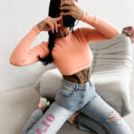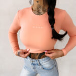 Długi rękaw oraz zabudowany dekolt równoważą krótki krój, tworząc harmonijną, bardzo kobiecą formę. To przemyślane połączenie sprawia, że top jest jednocześnie subtelny i wyrazisty.