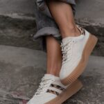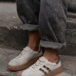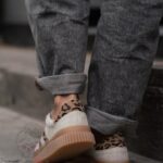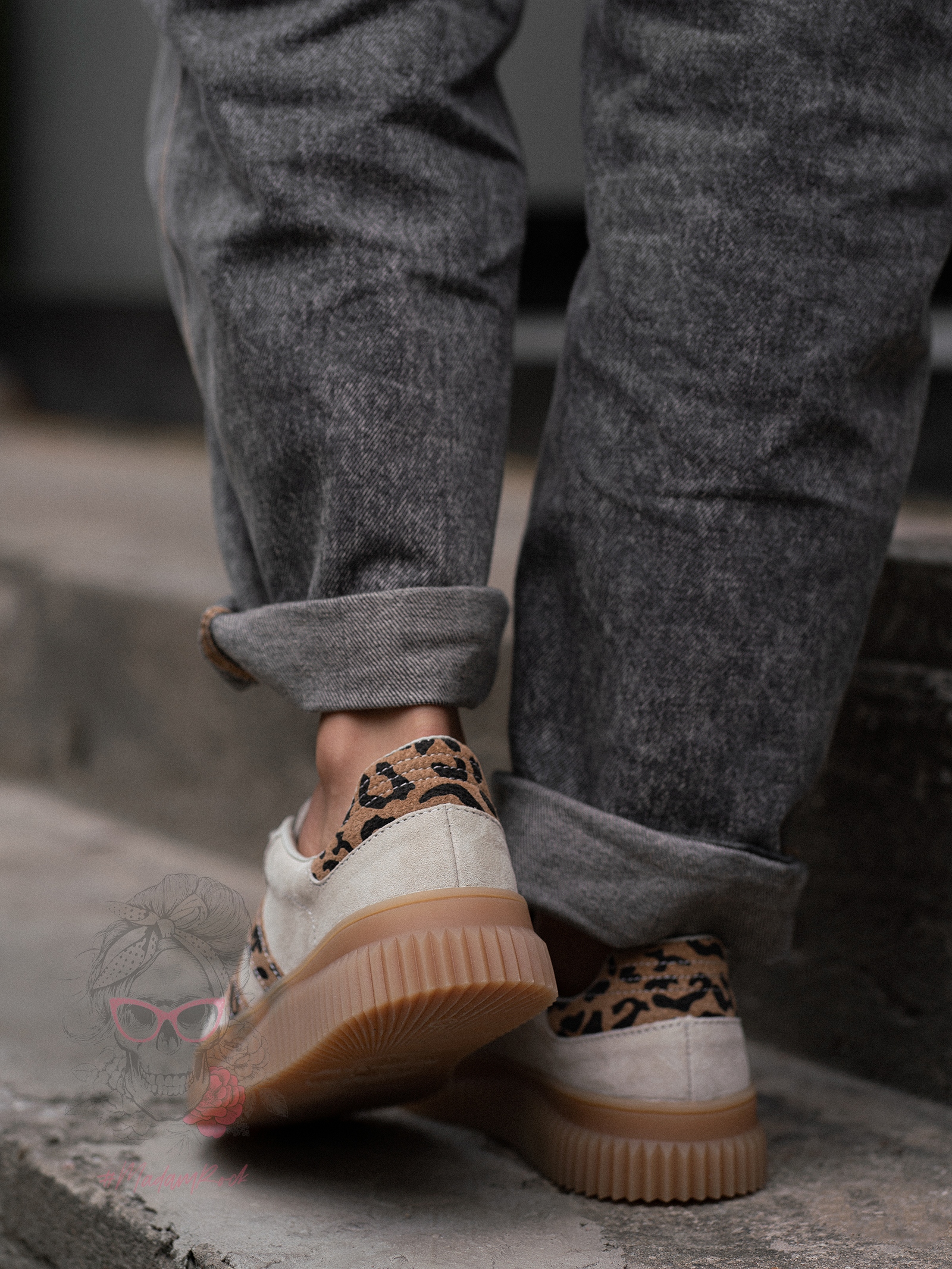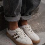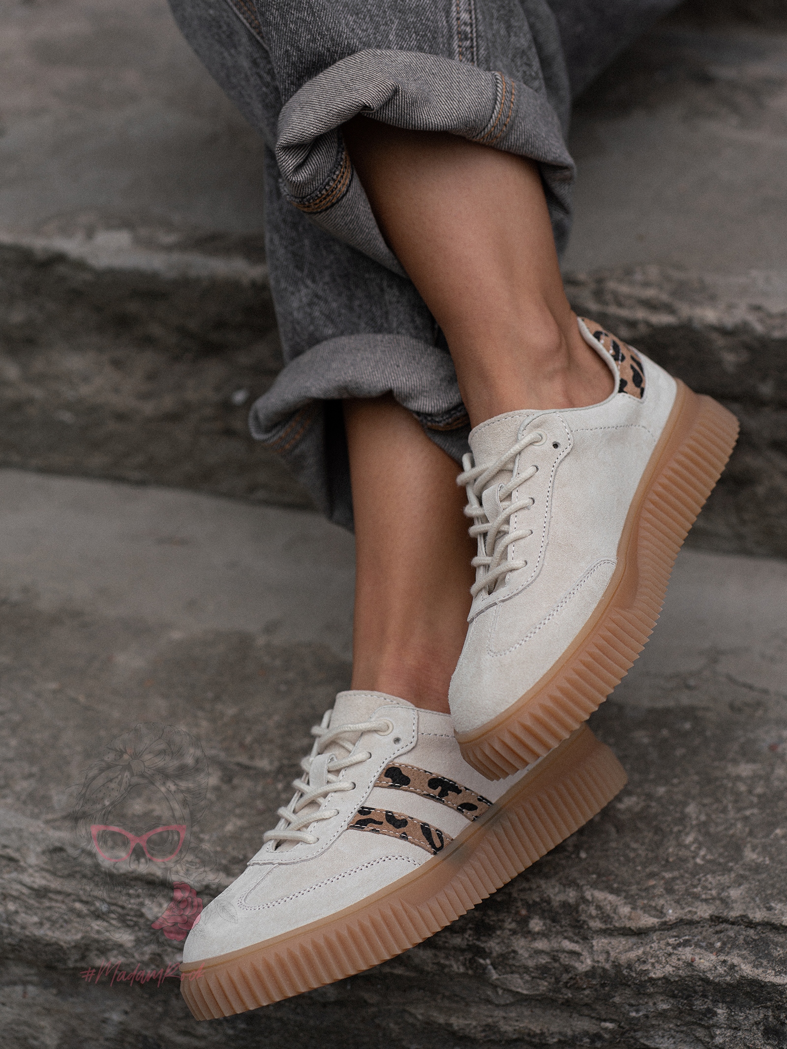 Damskie trampki Madam Salia na beżowej, gumowej podeszwie o karbowanym wykończeniu to idealne połączenie klasycznego fasonu i modnych detali. Wykonane z wysokiej jakości naturalnego zamszu w subtelnym beżowym odcieniu, wyróżniają się zwężanym noskiem, który nadaje sylwetce lekkości. Uwagę przyciągają efektowne wstawki w panterkowy wzór, które dodają całości wyrazistego charakteru. Buty są wiązane na okrągłe sznurówki, co pozwala na dobre dopasowanie do stopy. To stylowa propozycja na co dzień, która łączy wygodę z modowym akcentem.