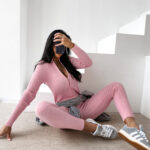 - Prążkowana struktura dzianiny skutecznie maskuje drobne niedoskonałości sylwetki, jednocześnie podkreślając jej naturalne, kobiece kształty.