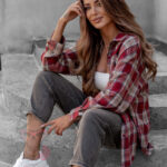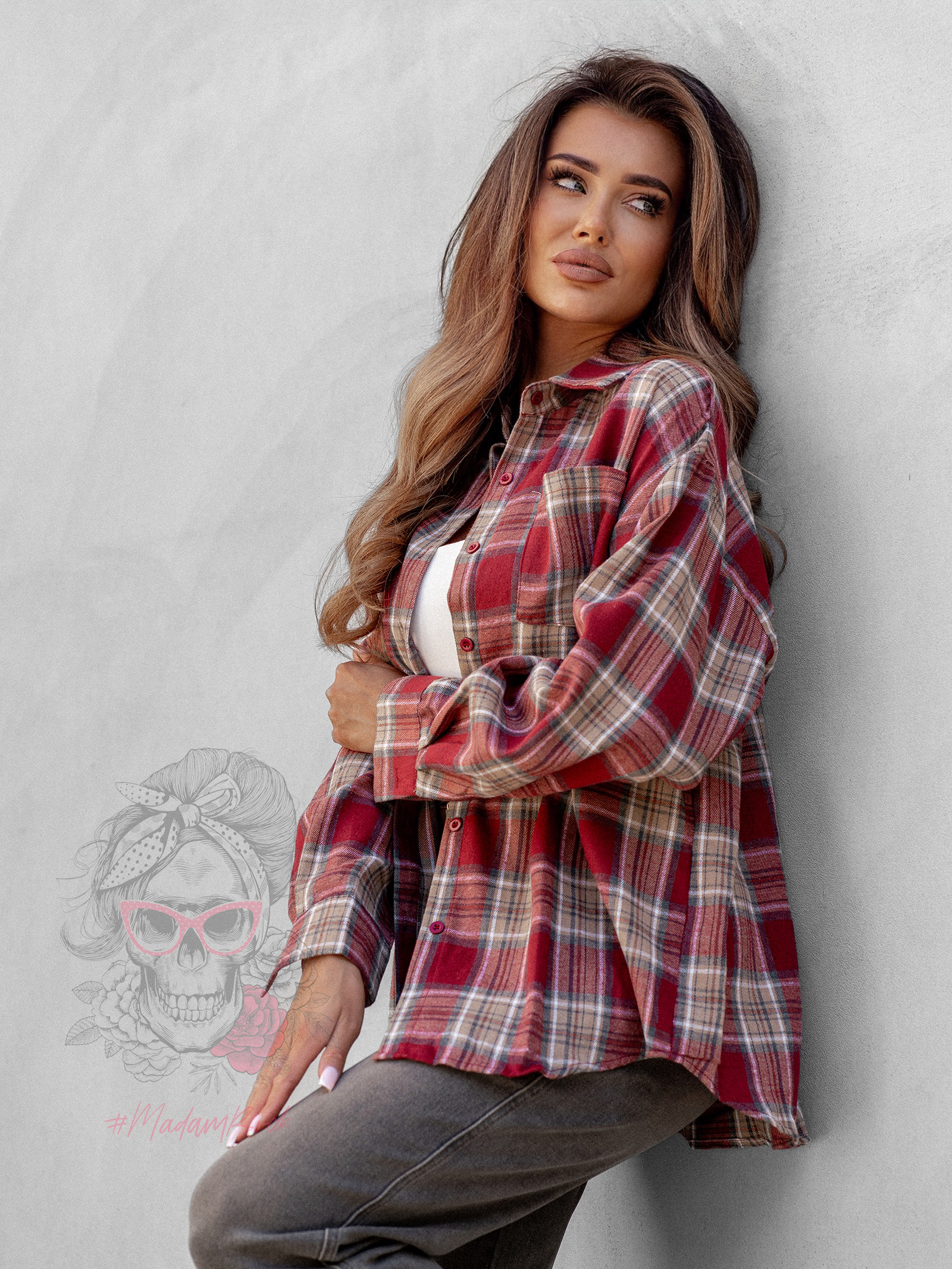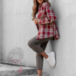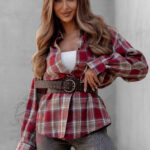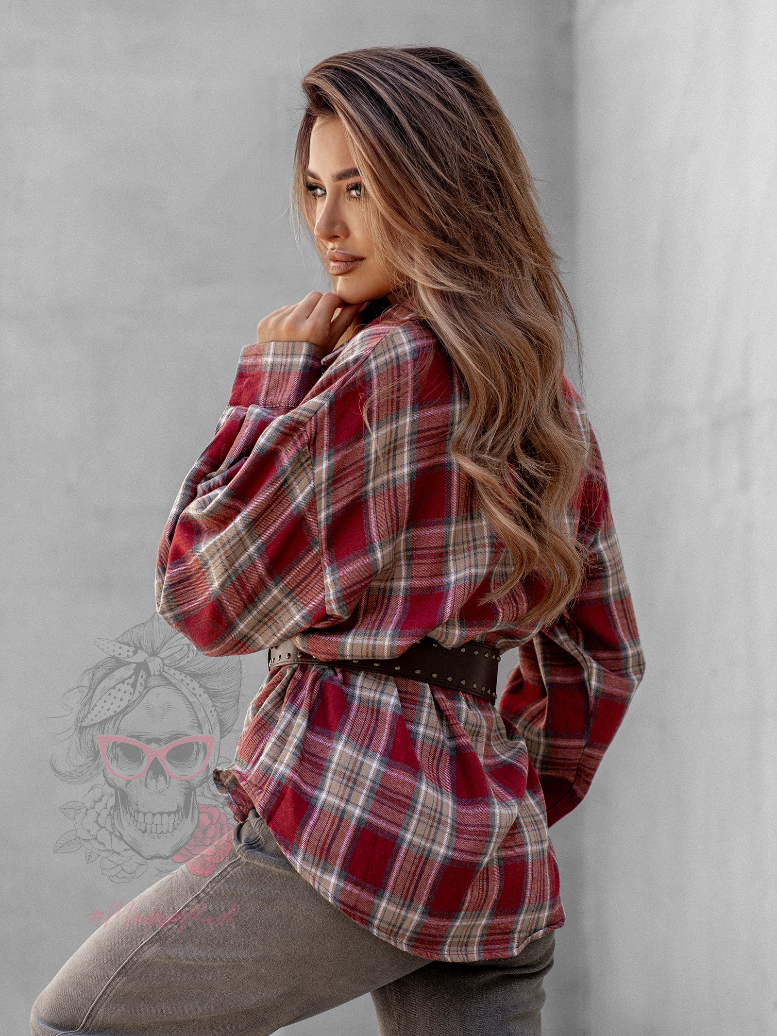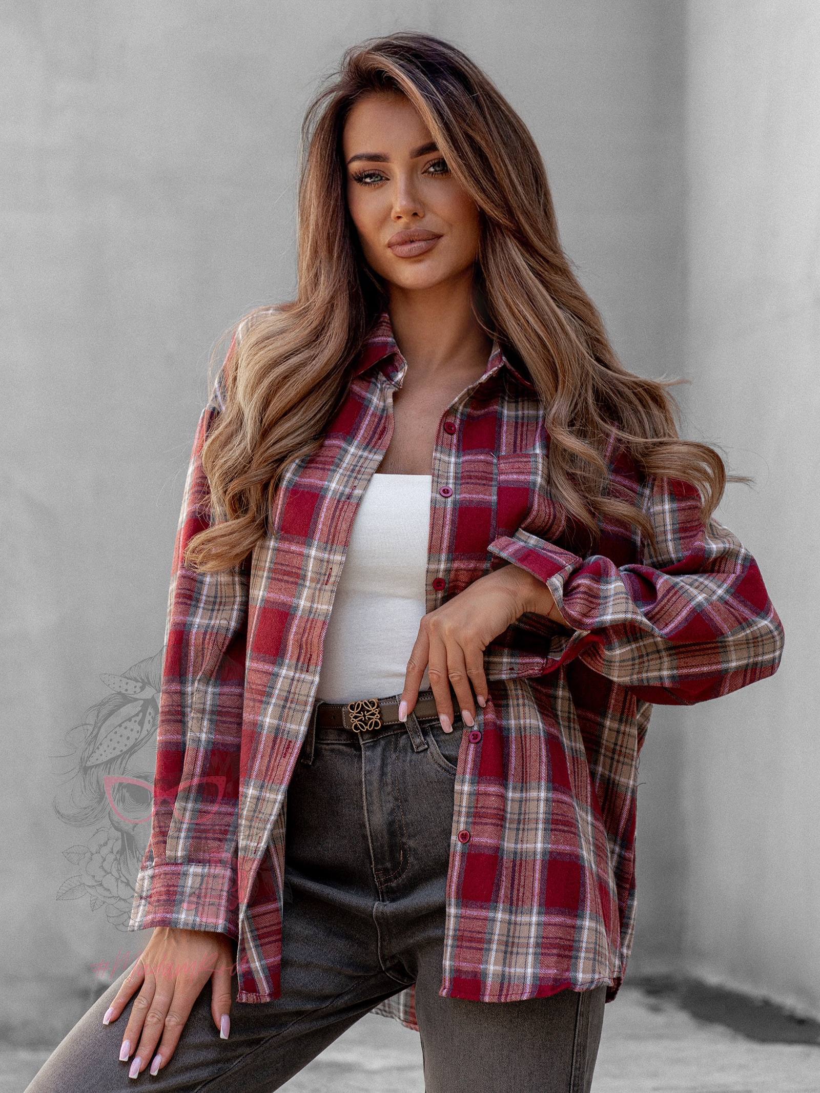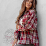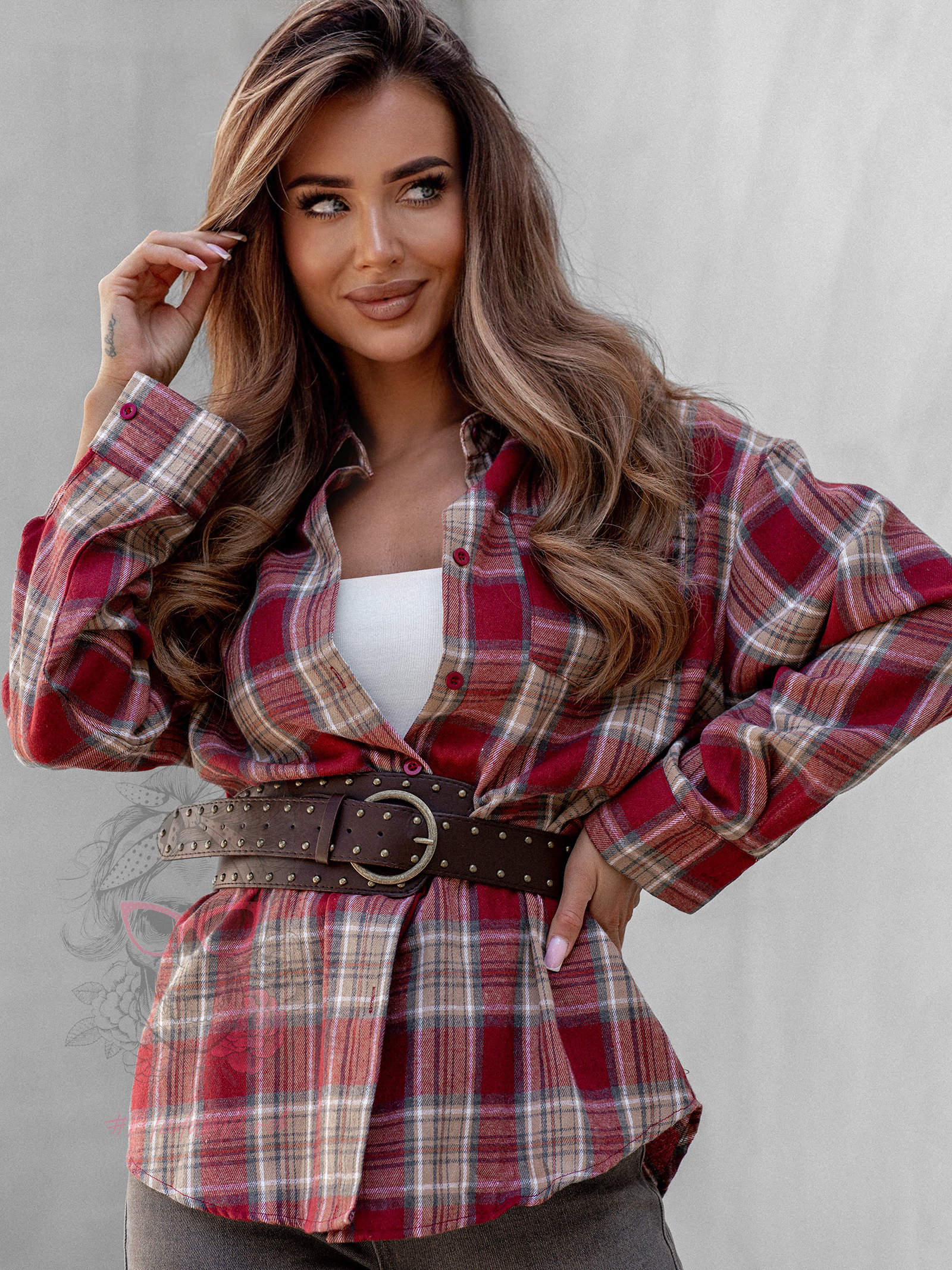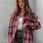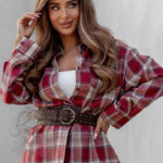 Koszula w kratę Awuro to klasyczny model flanelowy w odcieniach czerwieni, który łączy wygodę z ponadczasowym stylem. Wykonana z miękkiej flaneli, posiada kołnierzyk, kieszonkę z przodu oraz pełne zapięcie na guziki. Jej wyjątkowym akcentem jest szeroki pasek z ekoskóry w zestawie – ozdobiony złotą klamrą z efektem postarzenia, który podkreśla talię i dodaje koszuli eleganckiego charakteru.