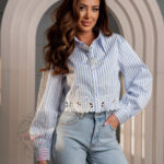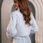 Koszula Monel w białe paski to stylowy element garderoby, który łączy klasyczną elegancję z modowymi akcentami. Jej cropped fason pięknie podkreśla talię, dodając lekkości całej stylizacji, a jednocześnie zachowuje wyrafinowany charakter dzięki solidnej, sztywnej tkaninie.