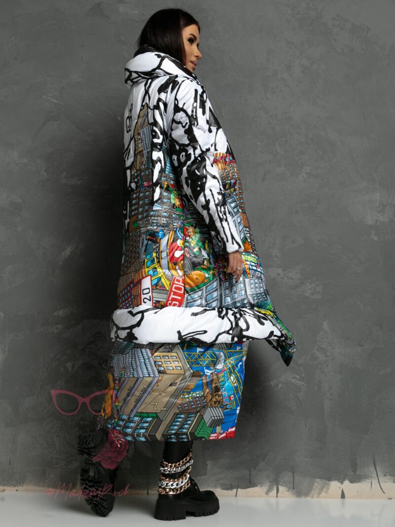 Asymetryczna kurtka Our City to idealny wybór na zbliżającą się zimę. Wykonana z wysokiej jakości, puchowego materiału. Model o oversizowym kroju świetnie dopasuje się do każdej sylwetki oraz zapewni wiele wygody i swobody ruchu. Kurtka zapinana na guziki z kieszeniami z przodu. Asymetryczny dół dodaje całości charteru, a kolorowy print, sprawi, że będziesz wyglądać niezwykle oryginalnie.