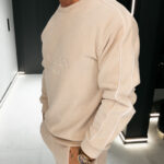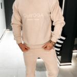 Górną część kompletu stanowi bluza o klasycznym kroju z okrągłym dekoltem, który nadaje całości ponadczasowy charakter. Długie rękawy wykończone elastycznymi ściągaczami zapewniają stabilność fasonu oraz estetyczne dopasowanie. Subtelny, tłoczony haft z logo OLAVOGA oraz hasłem „ESSENCE OF COMFORT” umieszczony na przodzie stanowi elegancki, nowoczesny detal brandingowy. Wzdłuż rękawów poprowadzono delikatne kontrastowe lampasy, które przełamują minimalistyczną formę i nadają bluzie modowego wyrazu.