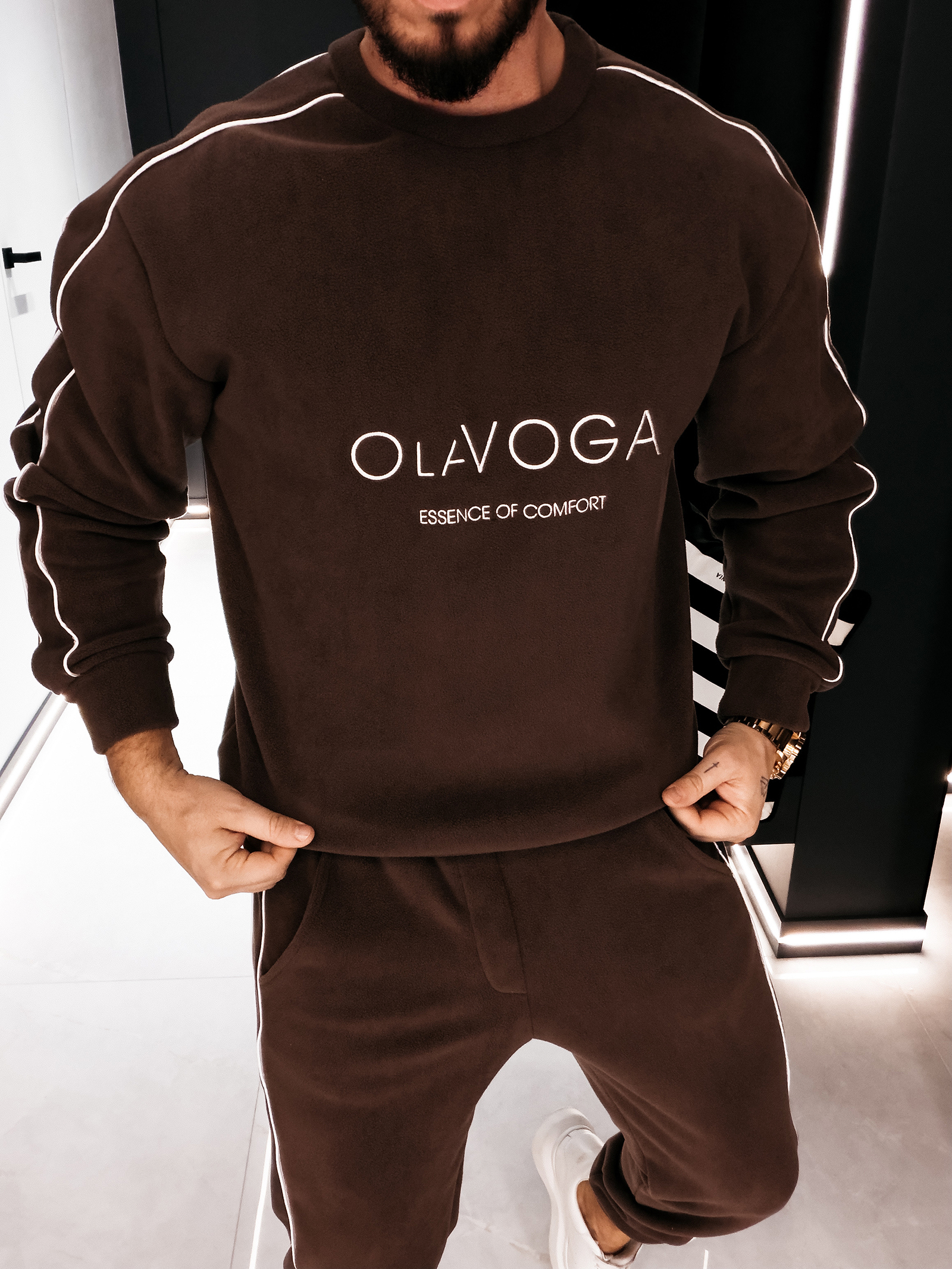 Górną część kompletu stanowi bluza o klasycznym kroju z okrągłym dekoltem, który nadaje całości ponadczasowy charakter. Długie rękawy wykończone elastycznymi ściągaczami zapewniają stabilność fasonu oraz estetyczne dopasowanie. Subtelny, tłoczony haft z logo OLAVOGA oraz hasłem „ESSENCE OF COMFORT” umieszczony na przodzie stanowi elegancki, nowoczesny detal brandingowy. Wzdłuż rękawów poprowadzono delikatne kontrastowe lampasy, które przełamują minimalistyczną formę i nadają bluzie modowego wyrazu.