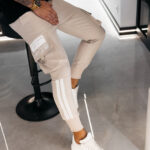 Elastyczna guma w pasie oraz regulacja za pomocą sznurka umożliwiają idealne dopasowanie do sylwetki. Nogawki wykończone ściągaczami z dekoracyjnymi wstawkami po bokach podkreślają dynamiczny charakter modelu i nadają mu nowoczesnej lekkości. To spodnie, które doskonale komponują się z bluzami, kurtkami oraz sneakersami premium.