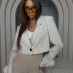 Marynarka posiada klasyczną formę z delikatnie zaznaczoną linią ramion dzięki subtelnym poduszkom, które nadają sylwetce harmonii i eleganckiego charakteru. Zapinana na jeden guzik, prezentuje się lekko i stylowo, zarówno w wersji zapiętej, jak i noszona swobodnie na top lub sukienkę. Krótka długość sprawia, że model świetnie komponuje się ze spodniami z wysokim stanem, spódnicami oraz dopasowanymi sukienkami.