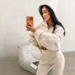 Na rękawie umieszczono wyraziste, haftowane logo marki OLAVOGA, które pełni funkcję mocnego, modowego akcentu. Dół kompletu stanowią spodnie z wysokim stanem i elastyczną talią, które modelują sylwetkę i zapewniają komfort noszenia. Nogawki o prostym kroju, delikatnie zwężane ku dołowi i wykończone ściągaczem, nadają całości nowoczesnej lekkości.