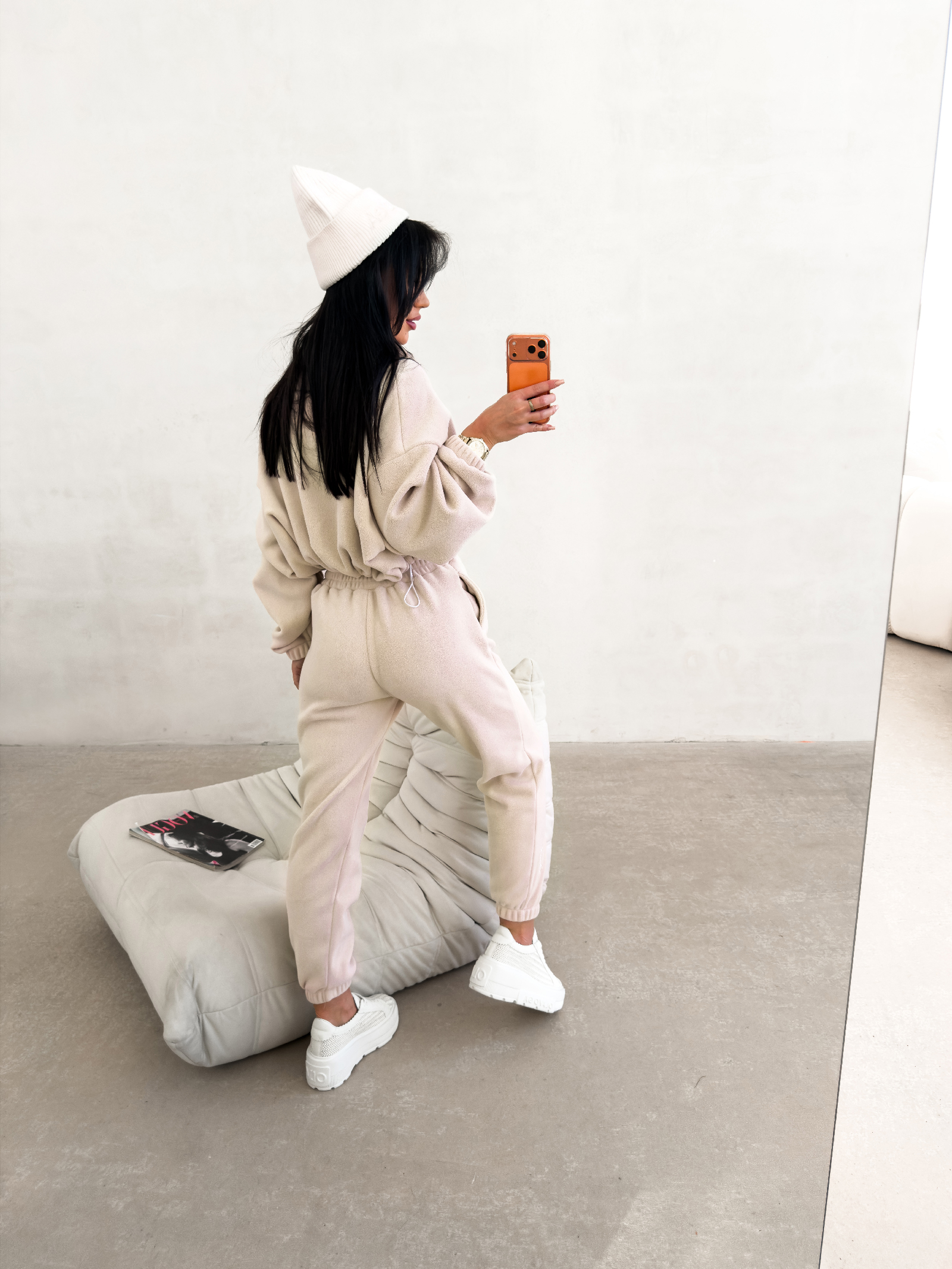 Górna część kompletu to krótka bluza zapinana na suwak, zaprojektowana w luźnym, lekko oversize’owym kroju. Taki fason podkreśla nowoczesny charakter zestawu i pozwala na swobodną stylizację zarówno z wysokim stanem spodni, jak i innymi elementami garderoby. Długie rękawy zakończone elastycznymi ściągaczami stabilizują formę bluzy i podkreślają jej casualowy styl.