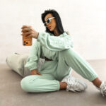 Na rękawie umieszczono wyraziste, haftowane logo marki OLAVOGA, które pełni funkcję mocnego, modowego akcentu. Dół kompletu stanowią spodnie z wysokim stanem i elastyczną talią, które modelują sylwetkę i zapewniają komfort noszenia. Nogawki o prostym kroju, delikatnie zwężane ku dołowi i wykończone ściągaczem, nadają całości nowoczesnej lekkości.