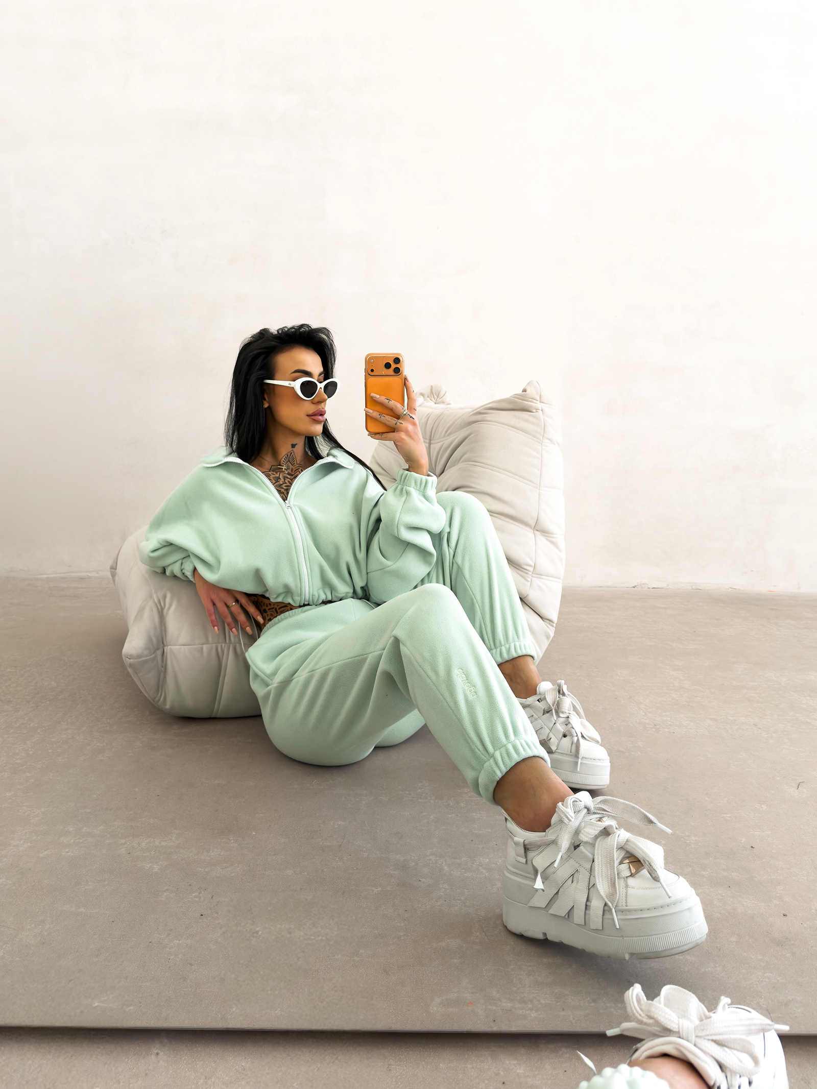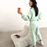 Górna część kompletu to krótka bluza zapinana na suwak, zaprojektowana w luźnym, lekko oversize’owym kroju. Taki fason podkreśla nowoczesny charakter zestawu i pozwala na swobodną stylizację zarówno z wysokim stanem spodni, jak i innymi elementami garderoby. Długie rękawy zakończone elastycznymi ściągaczami stabilizują formę bluzy i podkreślają jej casualowy styl.