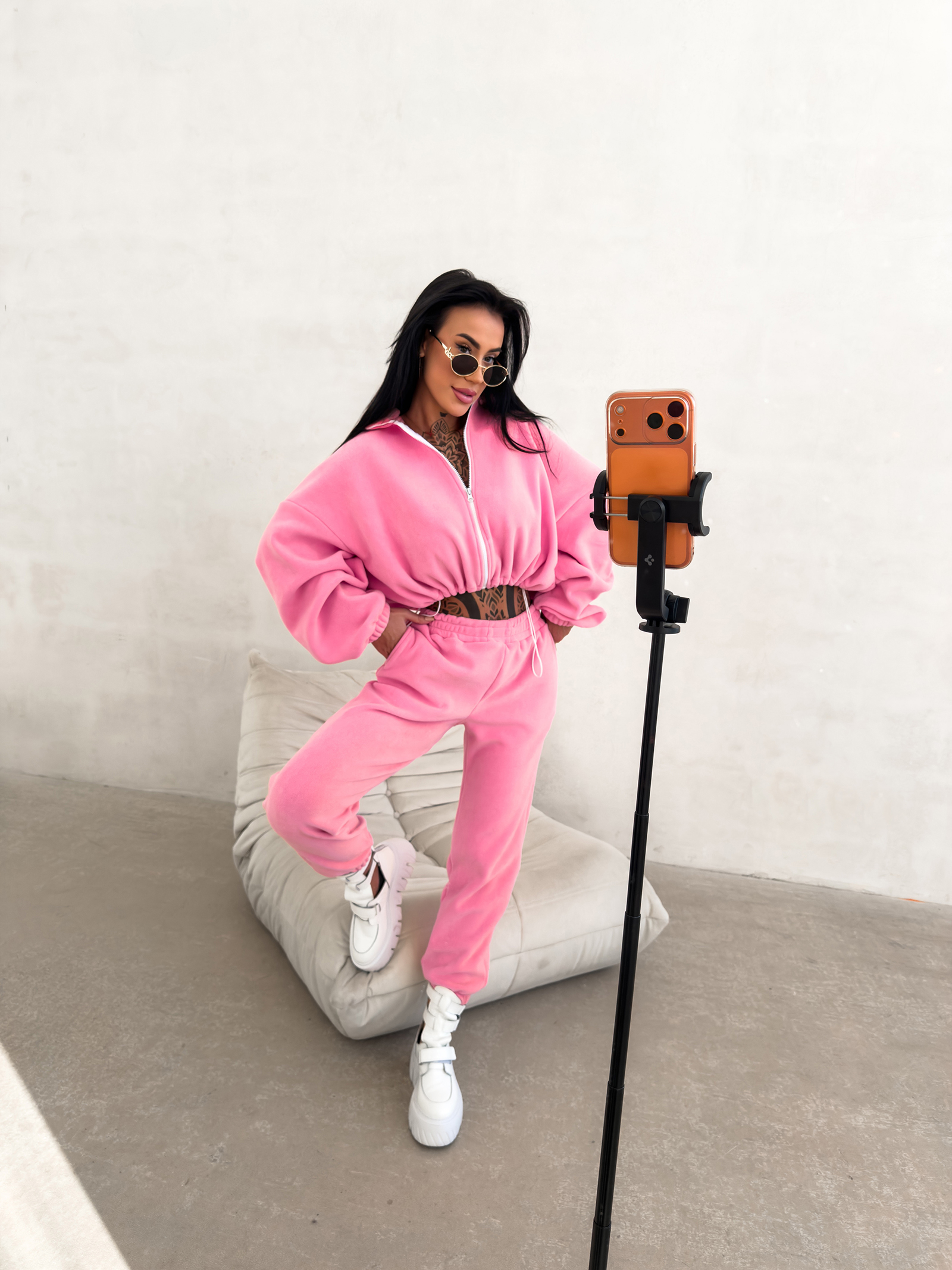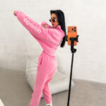 Górna część kompletu to krótka bluza zapinana na suwak, zaprojektowana w luźnym, lekko oversize’owym kroju. Taki fason podkreśla nowoczesny charakter zestawu i pozwala na swobodną stylizację zarówno z wysokim stanem spodni, jak i innymi elementami garderoby. Długie rękawy zakończone elastycznymi ściągaczami stabilizują formę bluzy i podkreślają jej casualowy styl.